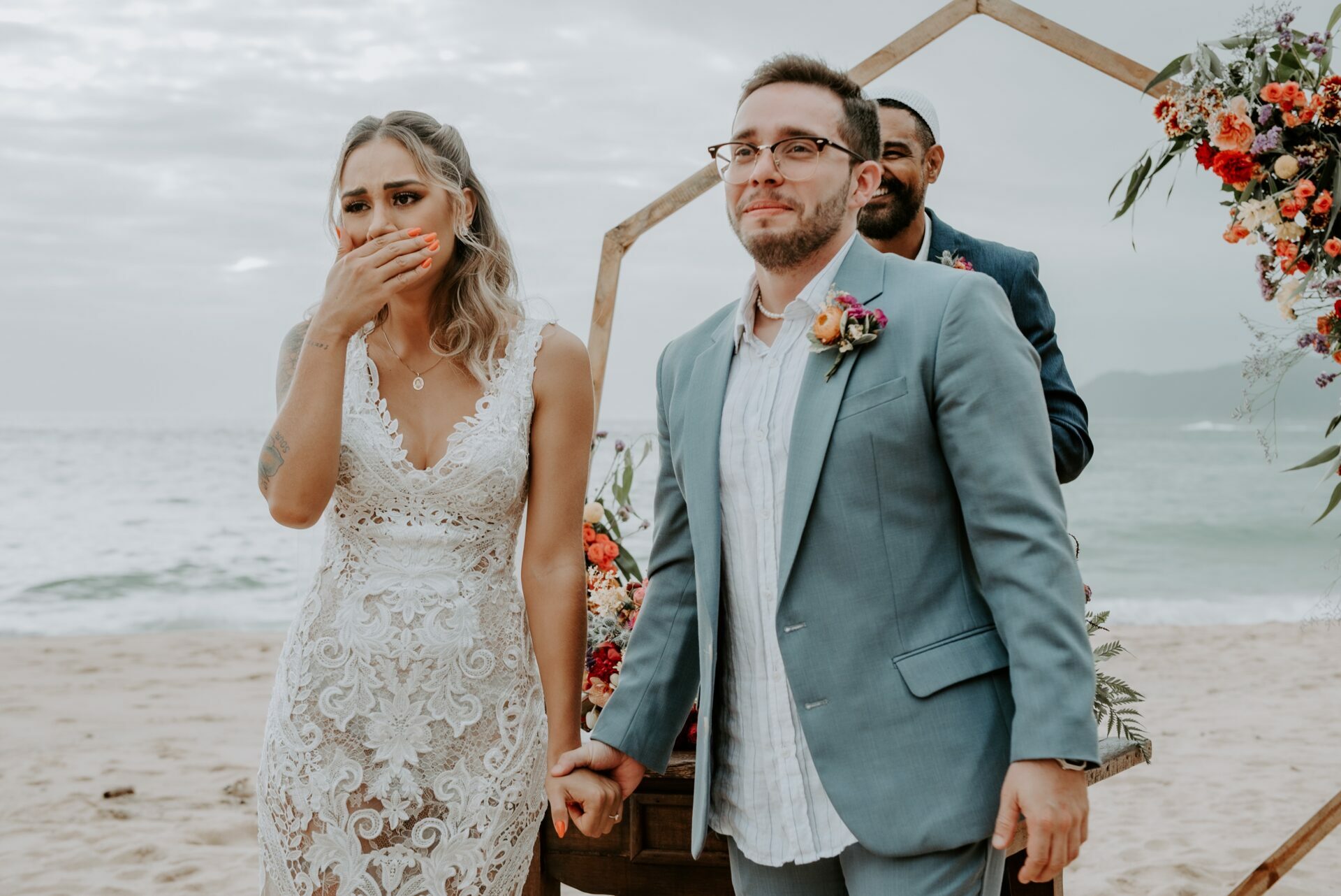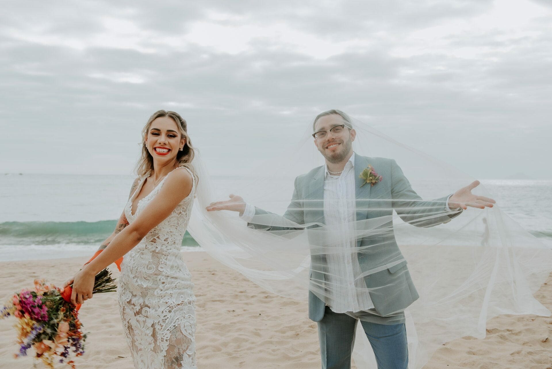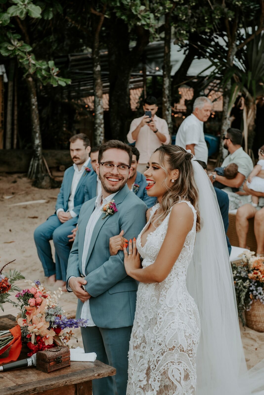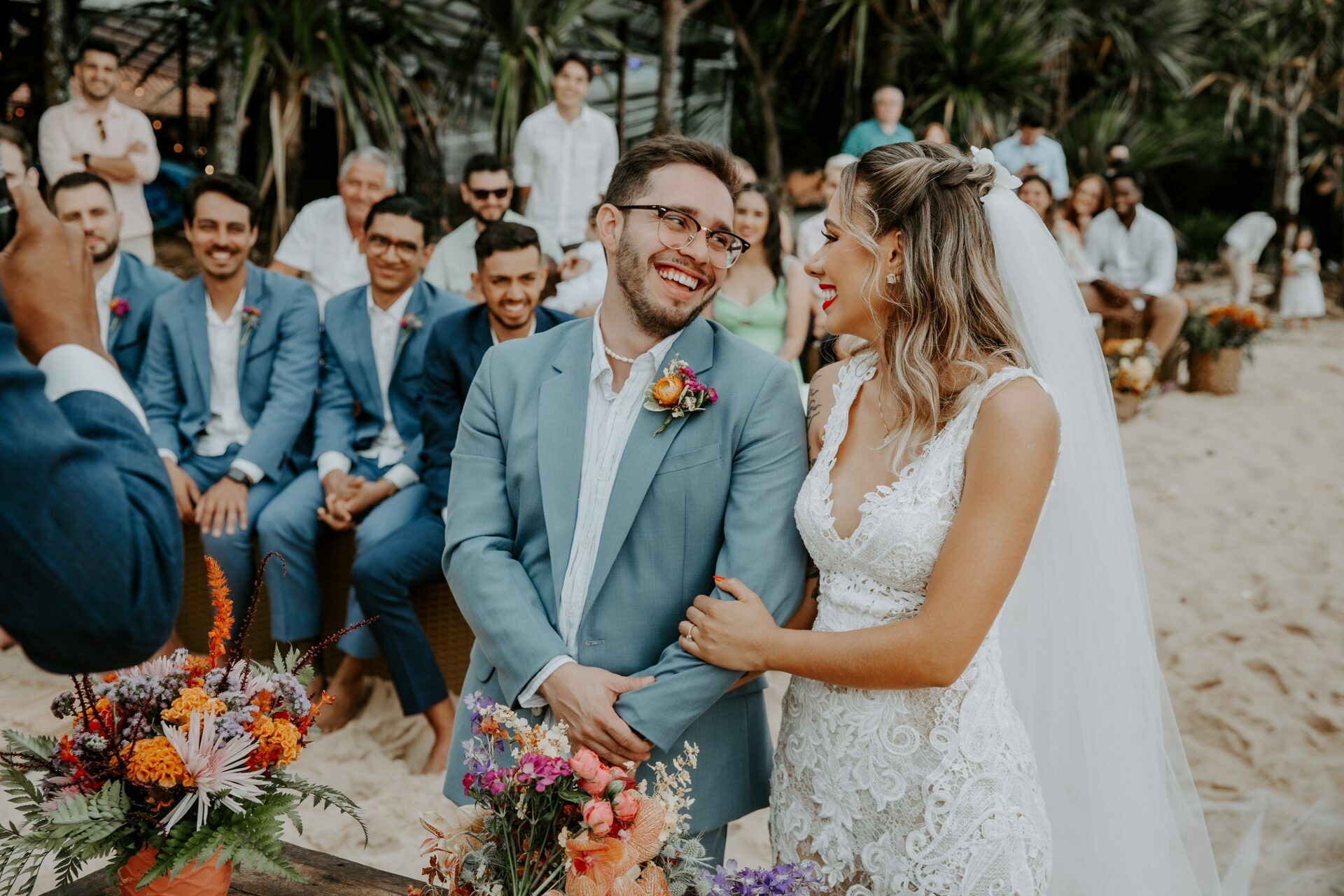 Cores, sorrisos em muito amor: casamento vibrante na praia
