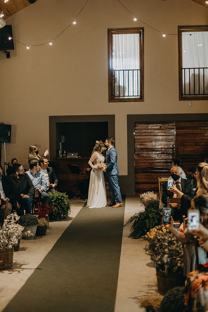 O enlace também teve first look, com o casal se vendo antes da cerimônia. Nesse sentido, eles foram além e entraram juntos, quebrando protocolos e satisfazendo as próprias vontades.