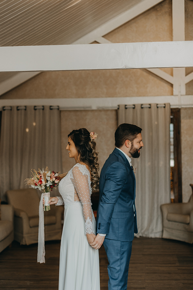 O enlace também teve first look, com o casal se vendo antes da cerimônia. Nesse sentido, eles foram além e entraram juntos, quebrando protocolos e satisfazendo as próprias vontades.
