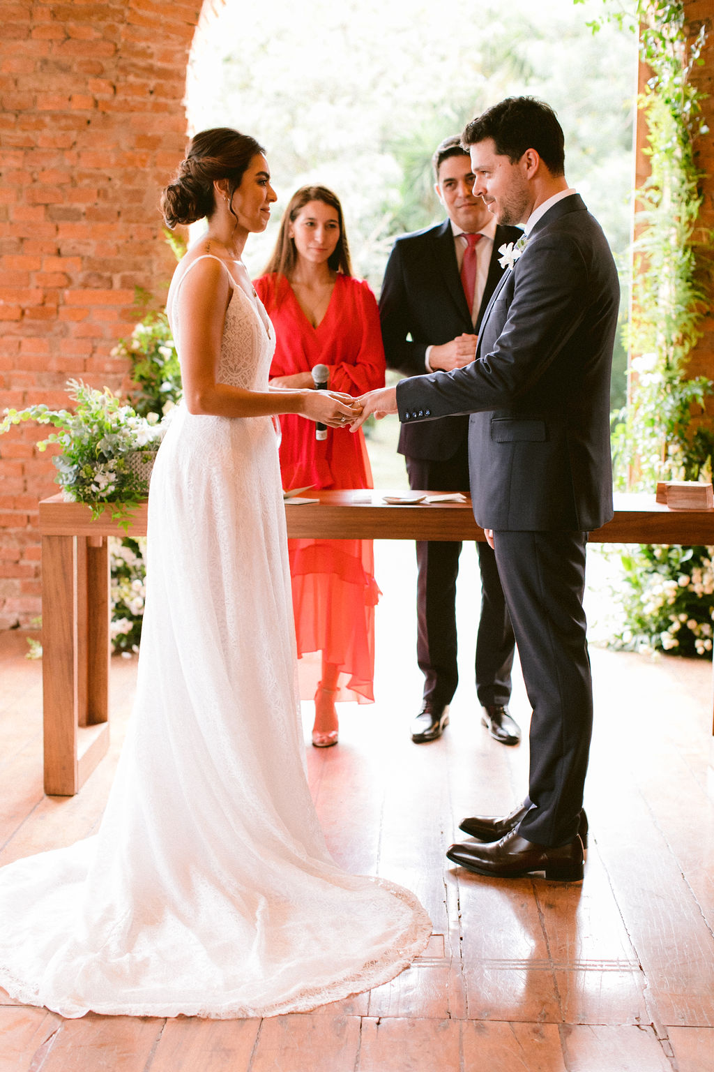 Eu e Gustavo entramos na cerimônia com nossos pais. Sobre as músicas, escolhemos canções que também fossem uma declaração. As alianças entraram antes de mim, porque eu queria uma cerimônia mais fluida e sem pausas.