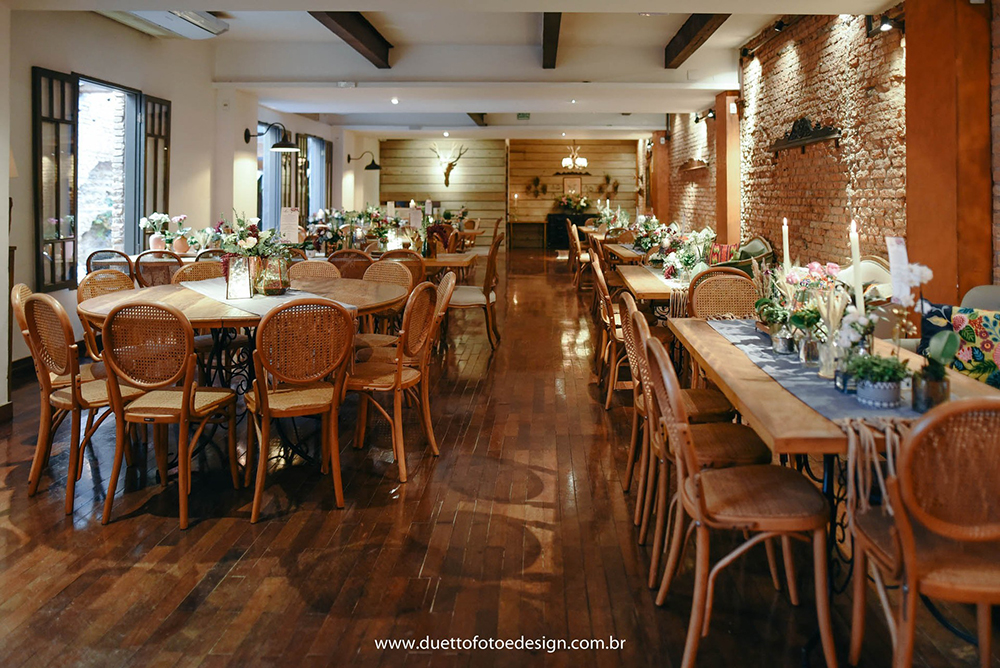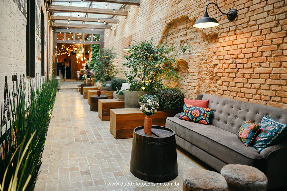 Procuramos alguns lugares e inicialmente visitamos o Espaço Quintal e a Casa Quintal. Achamos o Espaço maravilhoso, muitas árvores, aconchegante, porém pequeno e com muitas quebras no ambiente. Queríamos algum lugar que integrasse todo mundo. Já na Casa Quintal achamos que a pista de dança ficava distante do salão onde aconteceria a cerimônia e ficariam as mesas. Foi aí que descobrimos o Celeiro Quintal.