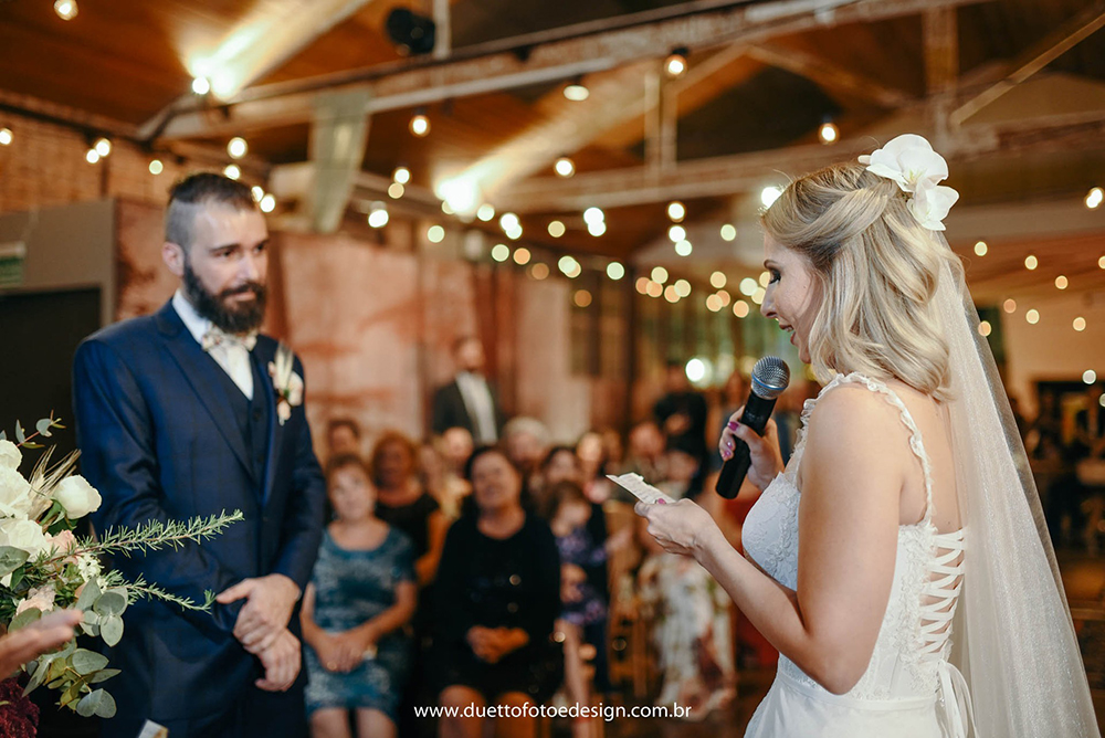 O celebrante foi o mais difícil. Já sabíamos que não queríamos uma cerimônia religiosa, pois acreditamos em Deus, mas não frequentamos igreja ou nada do tipo, então para nós não fazia sentido. A ideia era algo rápido, que não fosse cansativo. Ao mesmo tempo o ritual era importante pra nós, com votos e troca de alianças, então procuramos vários profissionais.