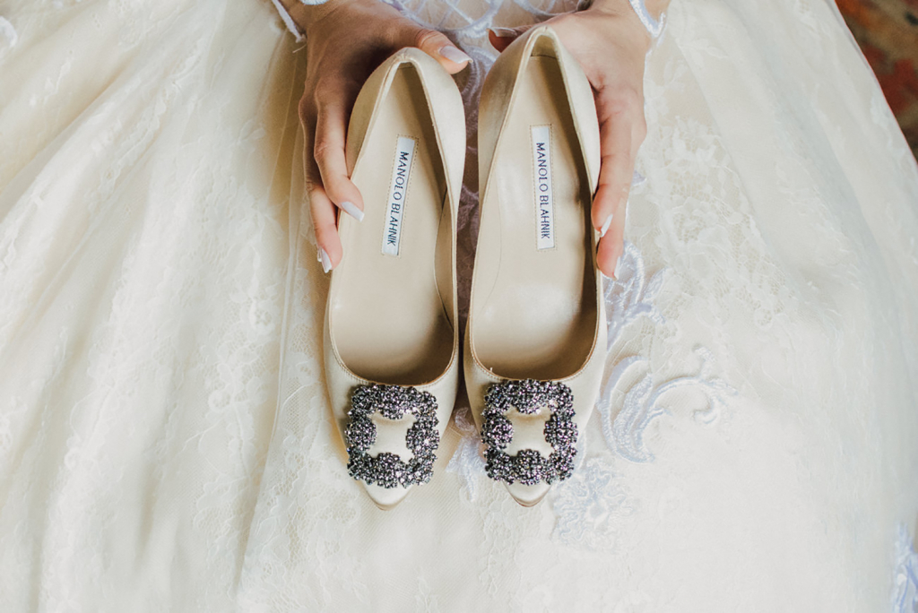 Meu sonho era casar com um Manolo Blahnik assim como a Carrie Bradshaw casou (a personagem principal da série Sex and the City). Esse sapato não é vendido no Brasil e para a minha sorte a tia do noivo estava em uma viagem em Londres, então encomendei o tão sonhado sapato com ela.