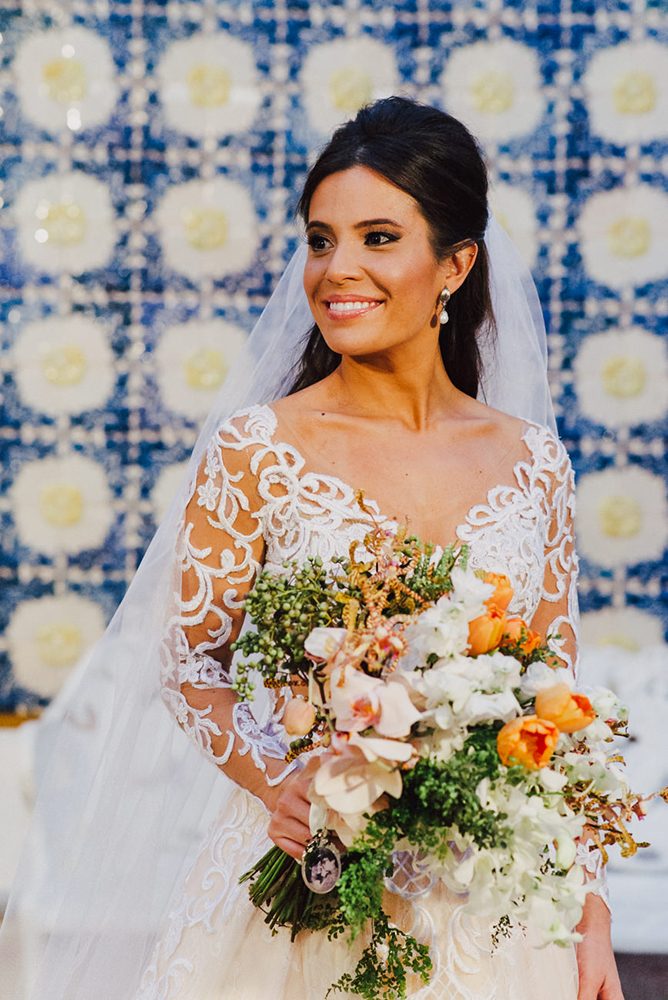 As joias eram da minha mãe e foram reformadas pela Laura Cunha. Escolhi tons pastéis para o buque, com o detalhe do relicário em homenagem aos meus pais.
