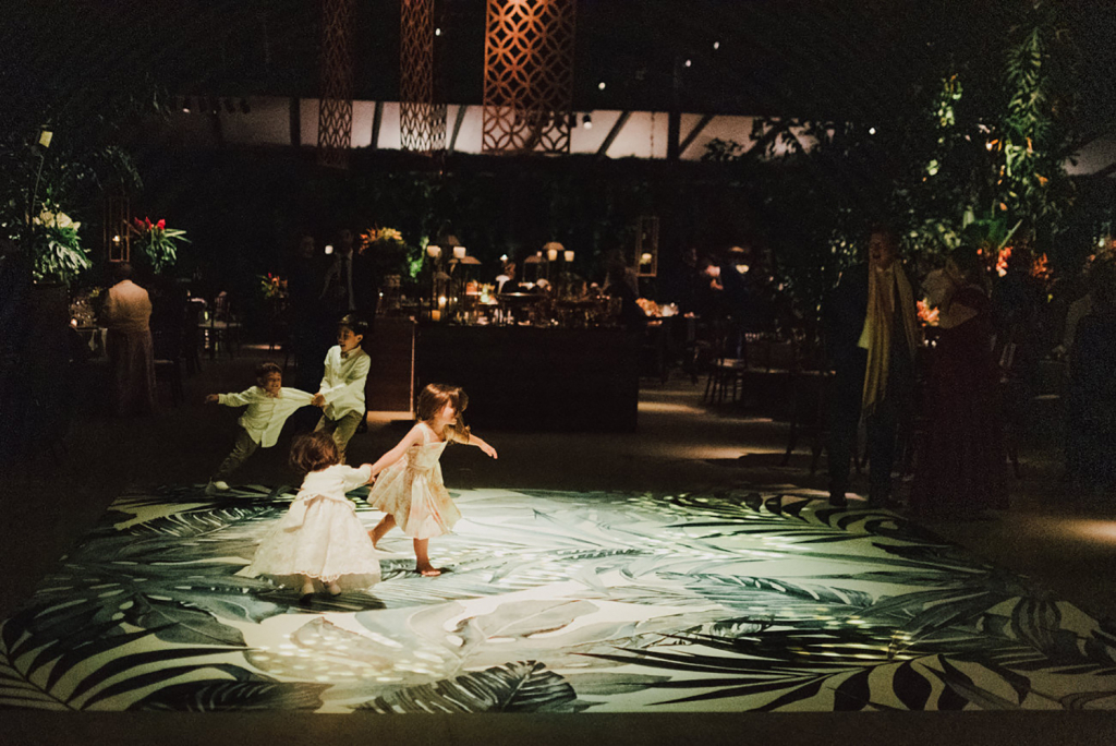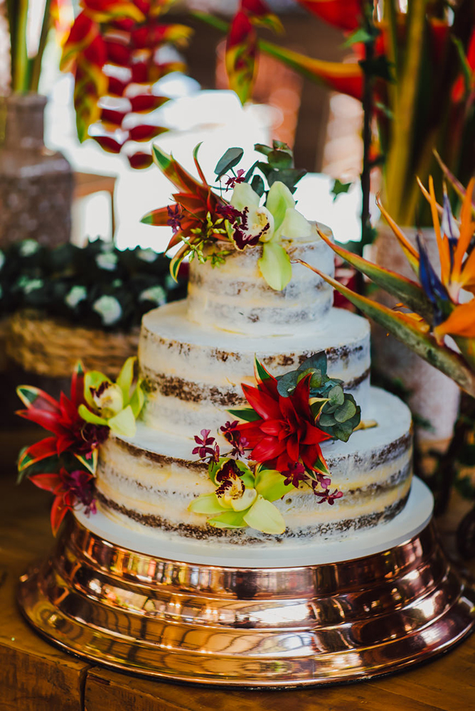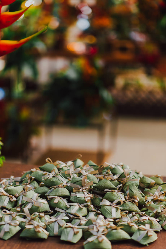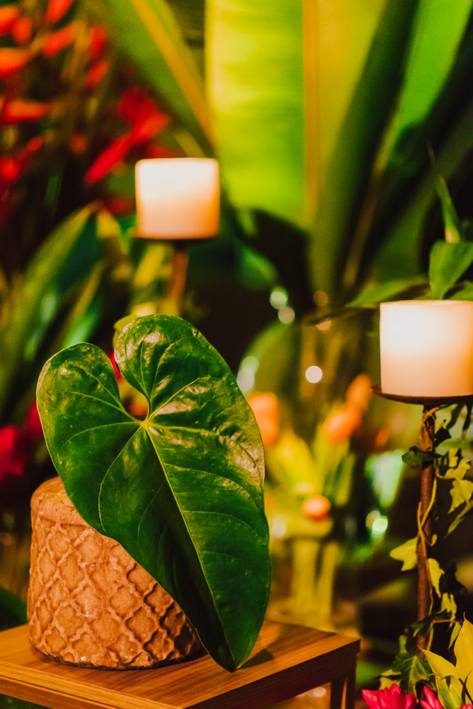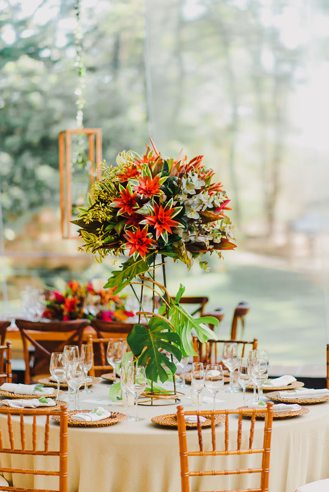 Para a recepção escolhemos uma decoração botânico-chique. Folhagens e flores exóticas. Decidimos não setorizar as mesas. Como a cerimônia foi no mesmo local que a recepção, os 200 convidados já se agrupavam e ficavam mais à vontade para escolher os lugares, tudo bem orgânico.