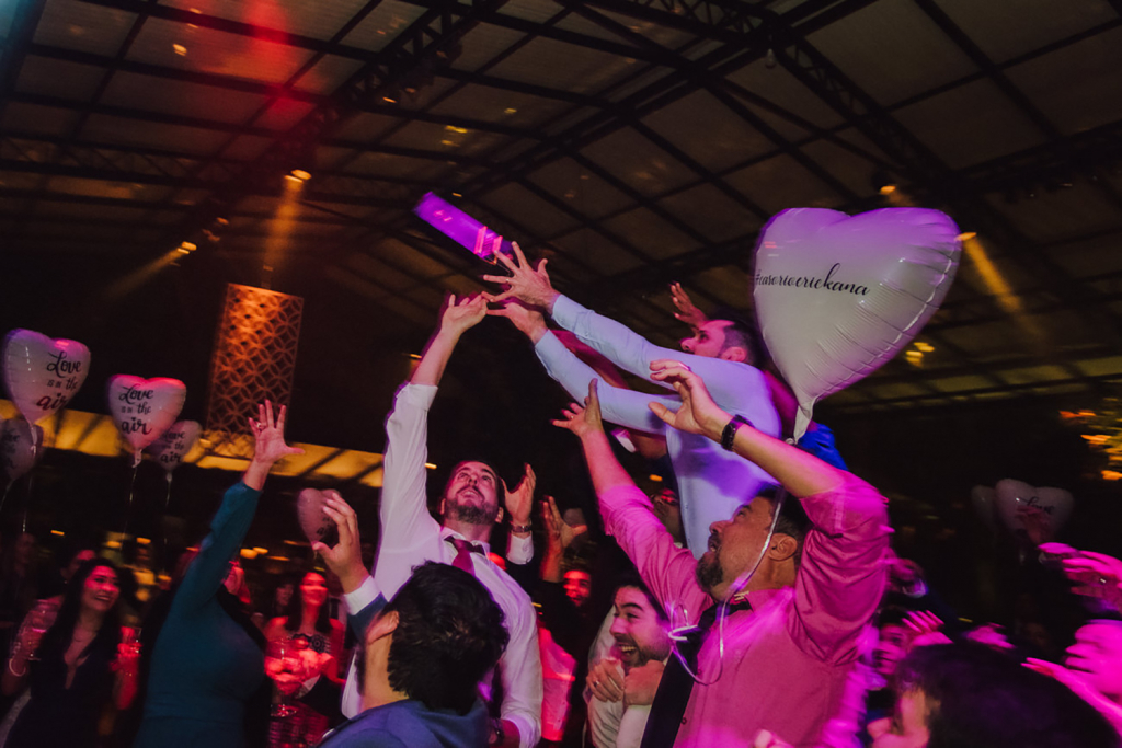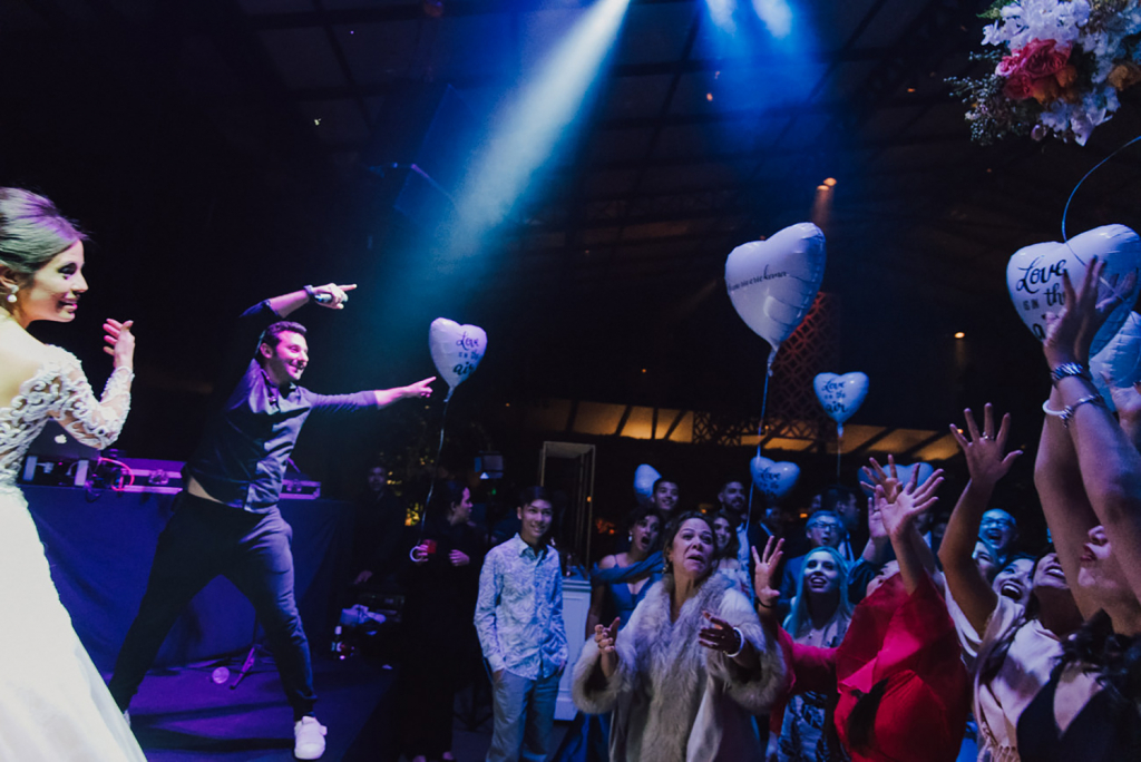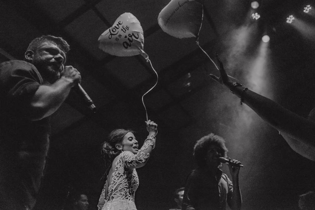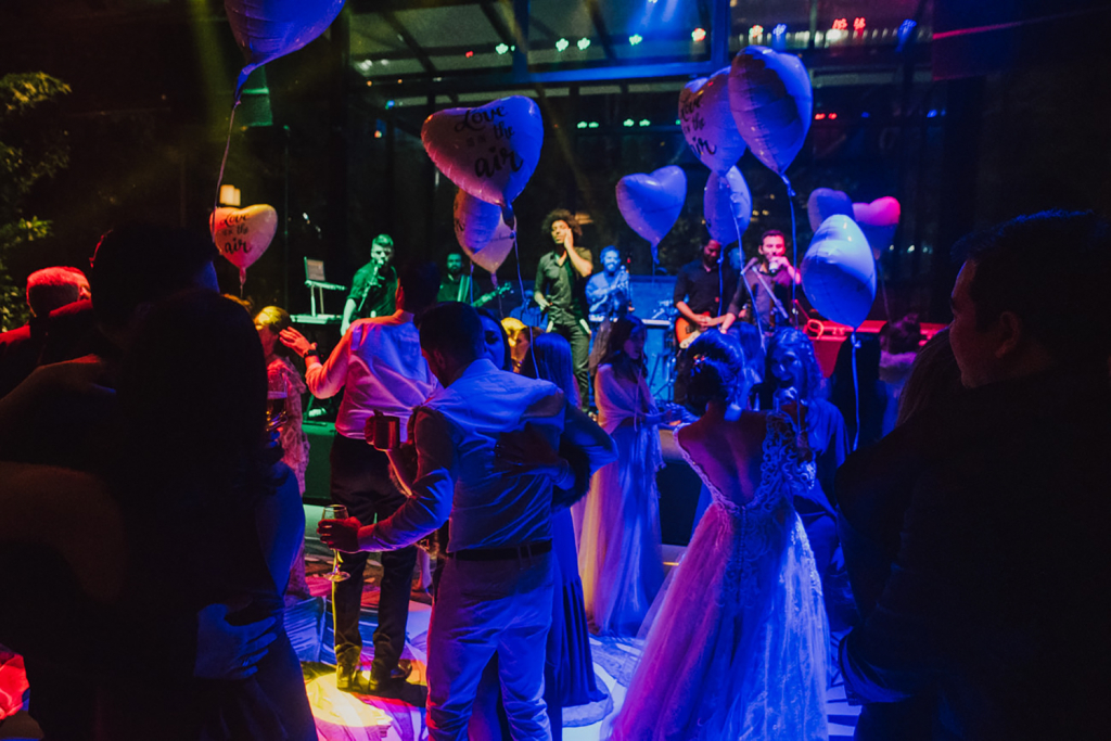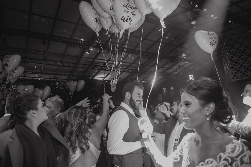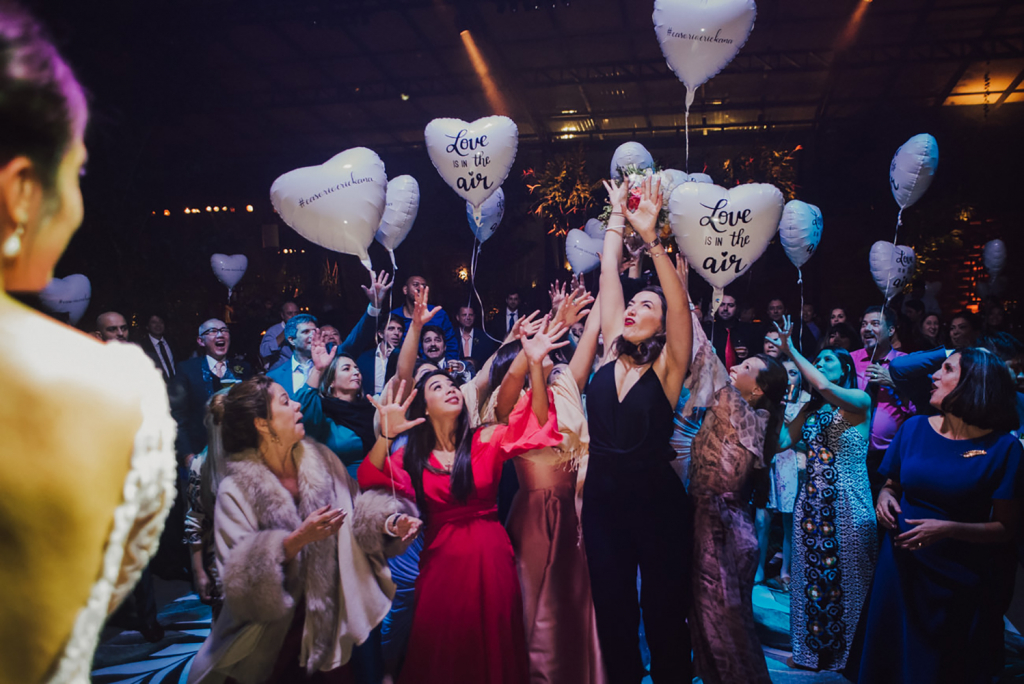 Balões personalizados com gás hélio foram entregues na pista com a frase Love is in the Air, e do outro lado a # do casamento, o que, na minha opinião, é divertido e fica muito mais bonito nas fotos que aqueles adornos (plumas, óculos, etc).