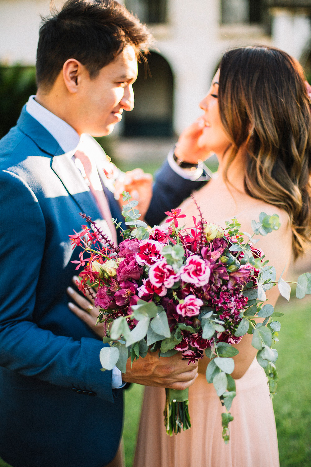 Além do buquê romântico e do bolo fofinho, os looks dos dois estão uma graça!