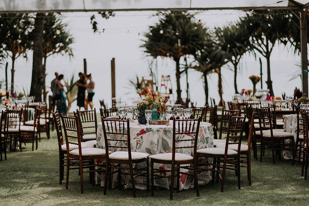 Durante a organização a gente conseguiu unir a praia do Jan com o lado mais caipira da Bárbara, rs. Como sou do interior, a gente trouxe o toque campestre para a decoração, com muitas flores, natureza e madeira.