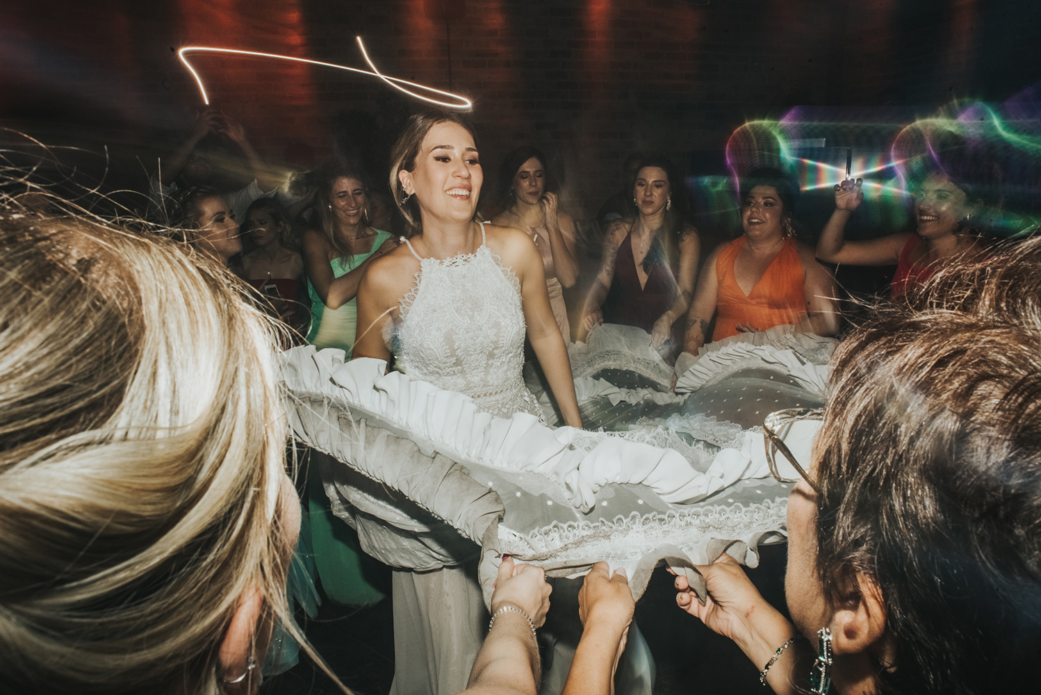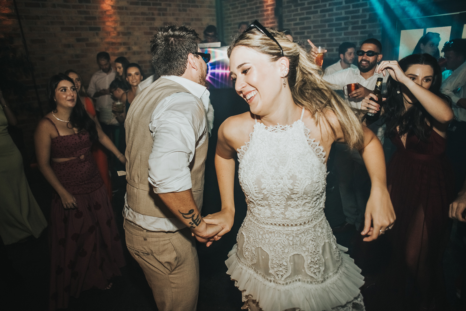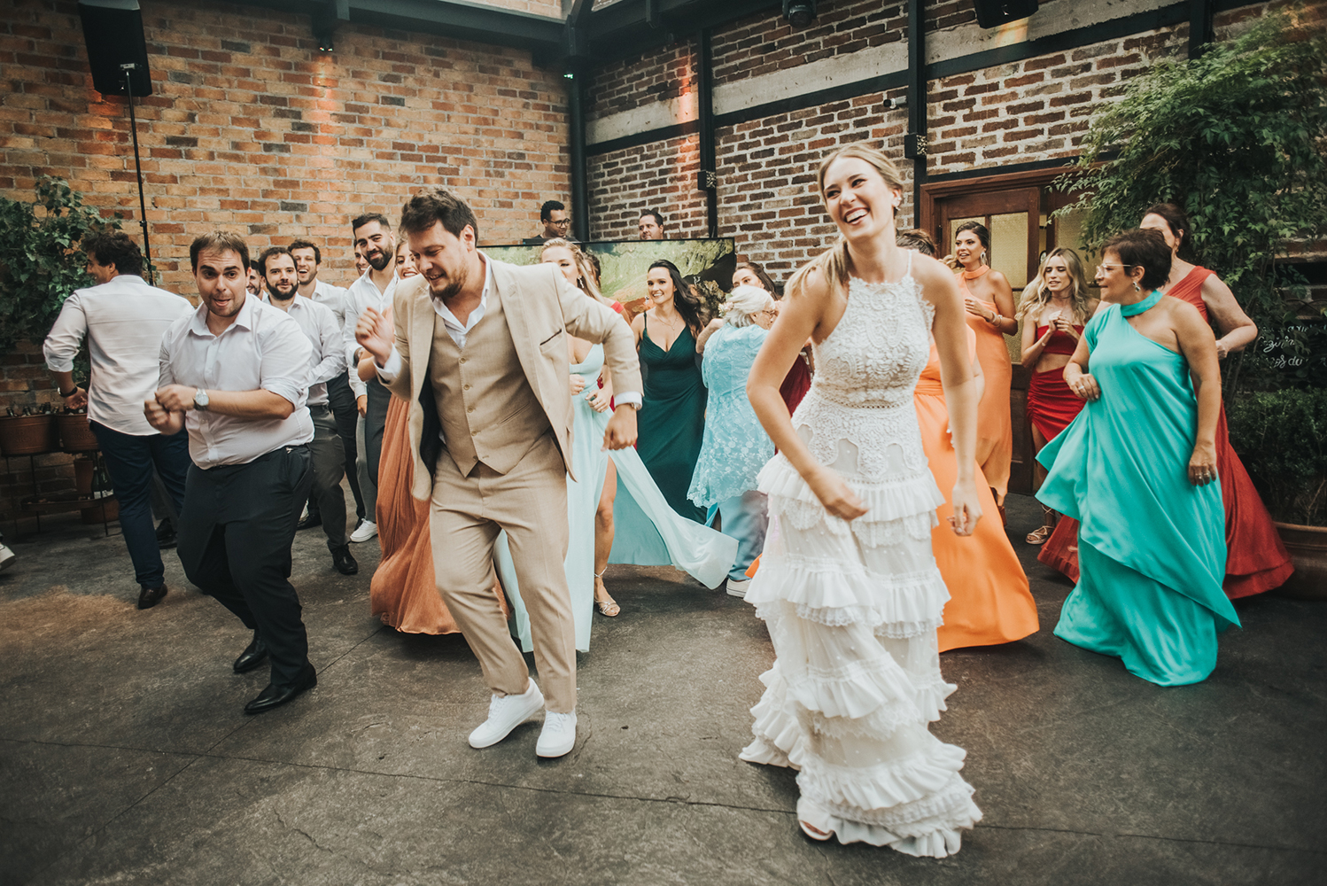 A dança dos noivos ficou por conta da nossa criatividade e buscamos fazer diferente do padrão. Abrimos a pista dançando com nossos padrinhos High School Musical. Todos eles são nossos amigos de longa data e passaram por todo o colégio e adolescência conosco, vivenciando essa fase do amadurecimento e dividindo muitas histórias (e foi mais uma forma de trazer a pitada Disney para o evento), provando que we’re all in this together“.