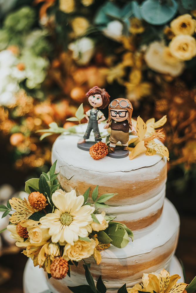Reparem, por exemplo, no topo de bolo. Os personagens de UP Altas Aventuras aparecem como alusão ao amor dos noivos pela Disney. Uma fofura!