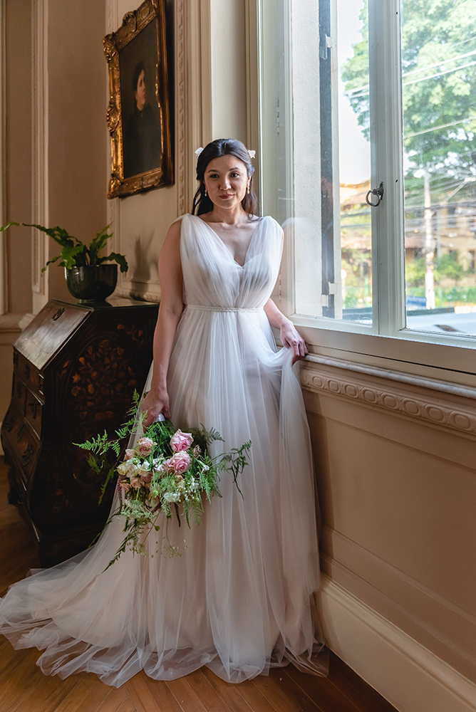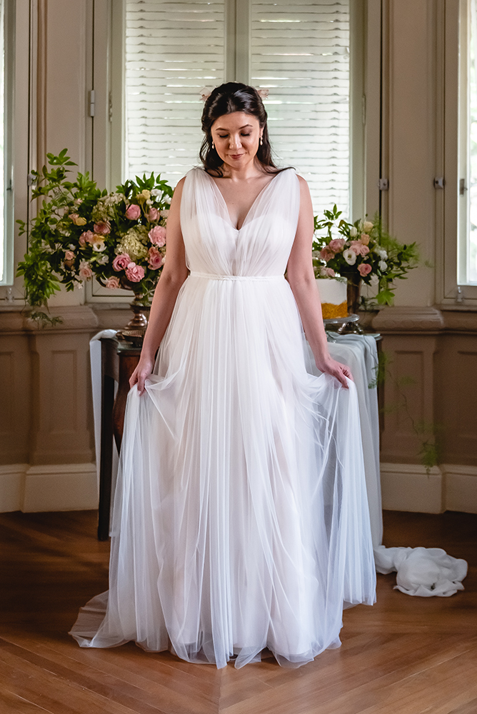 Solto e fluído, o vestido da estilista Pamela Gonzales revela a beleza do tule. E, como sabemos, tule nunca sai de moda!