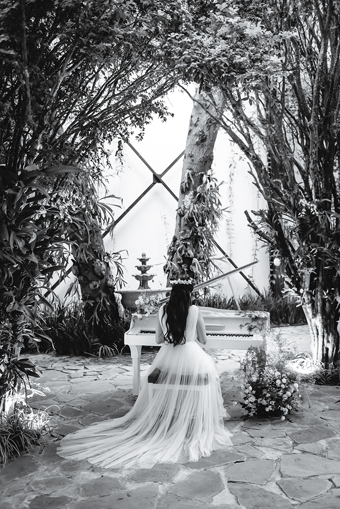 Um vestido cheio de movimento, um casarão cheio de história e a alegria de um jardim recebendo um piano de cauda representando essa liberdade.