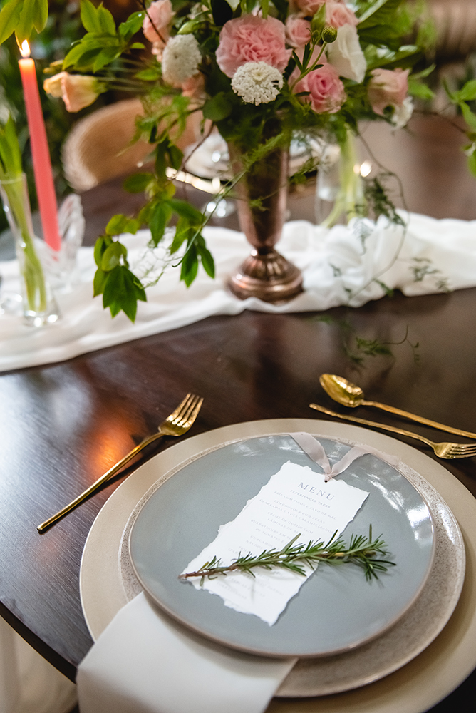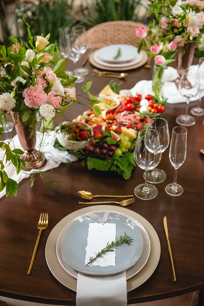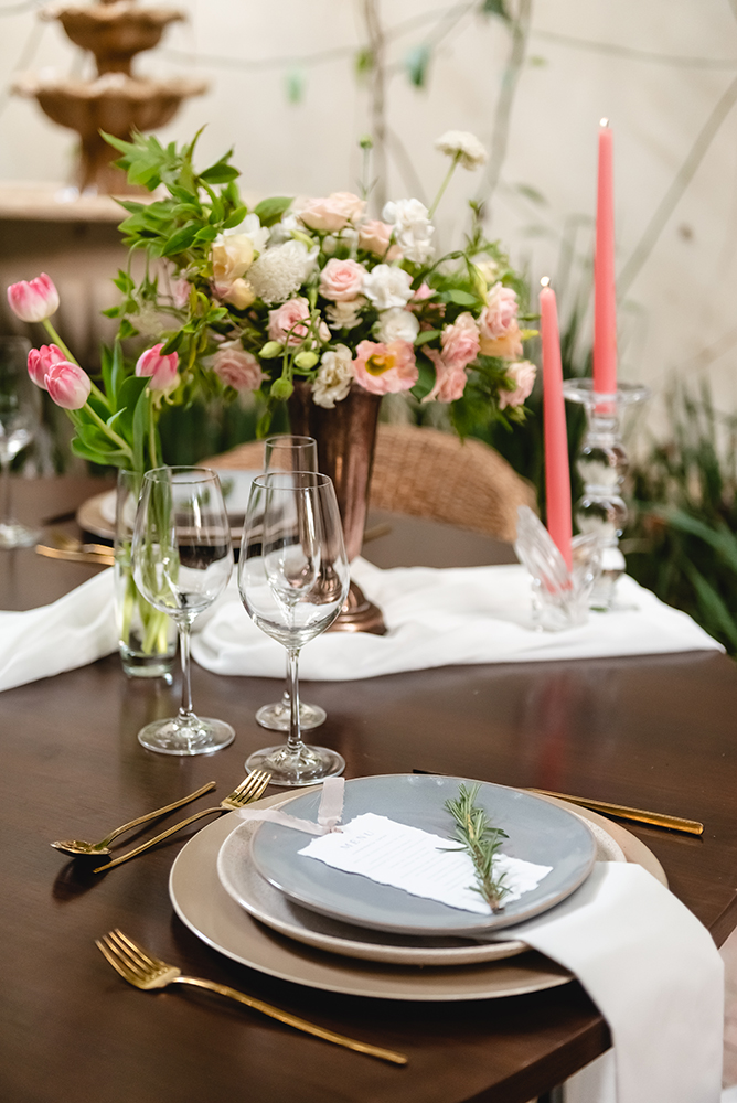A conexão vai desde uma beleza clean e leve para a noiva, com acessórios delicados, até a mistura de louças de cerâmica com castiçais de cristal. Sem falar na mesa posta ao ar livre, com uma gastronomia incrível.