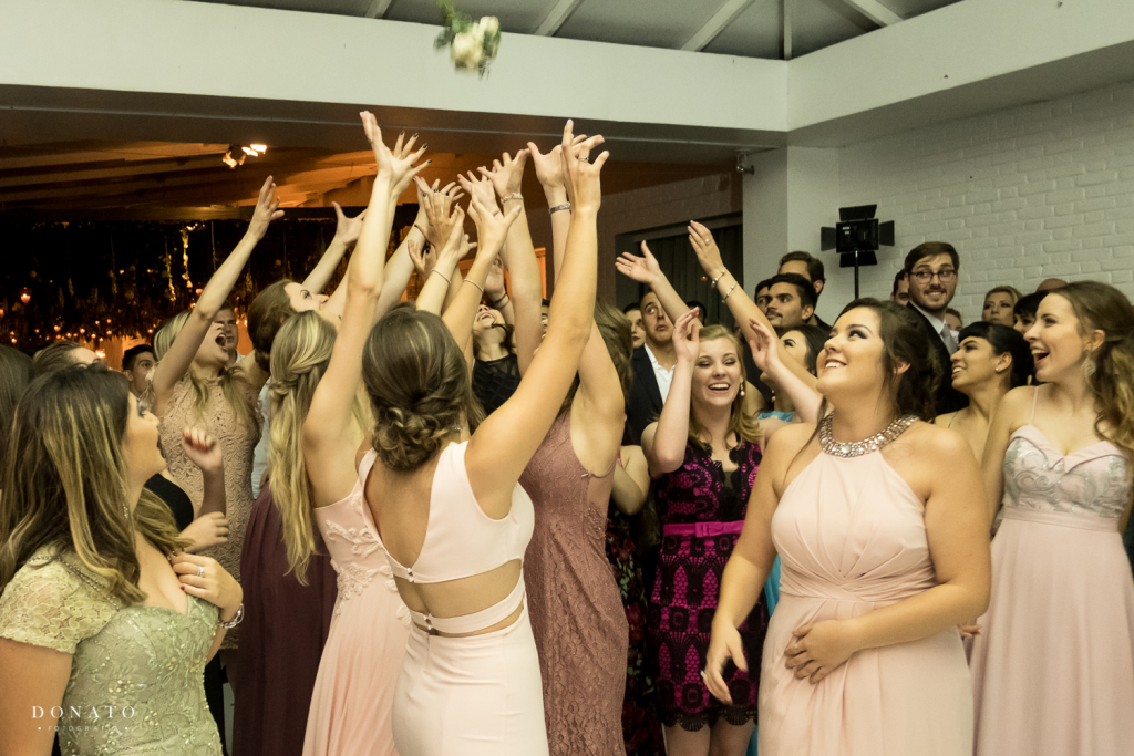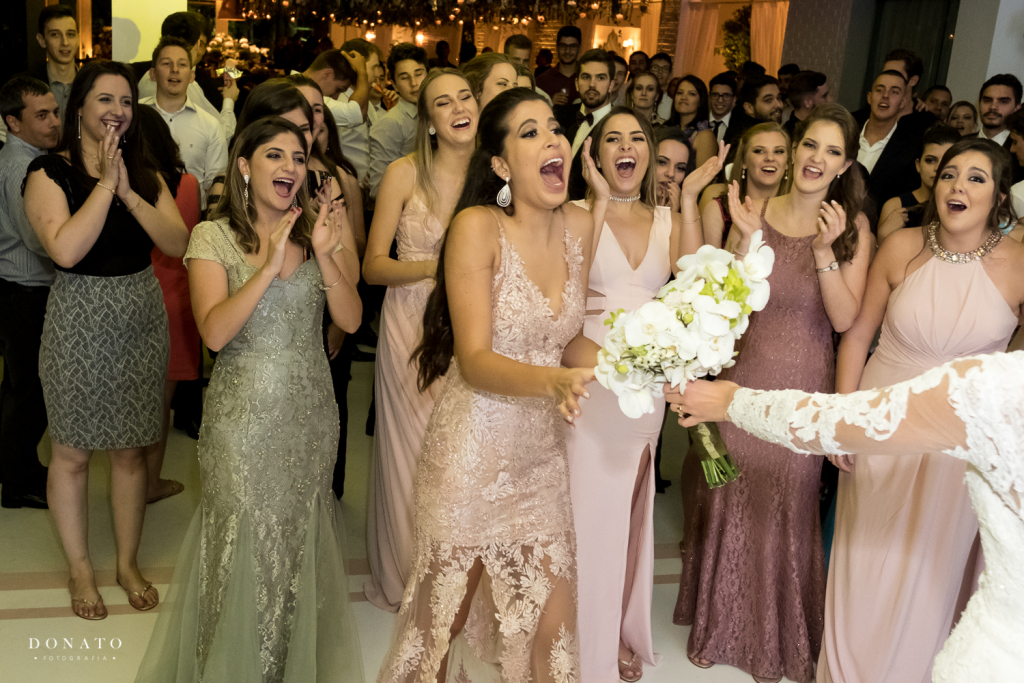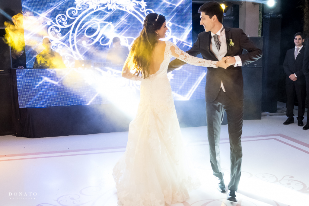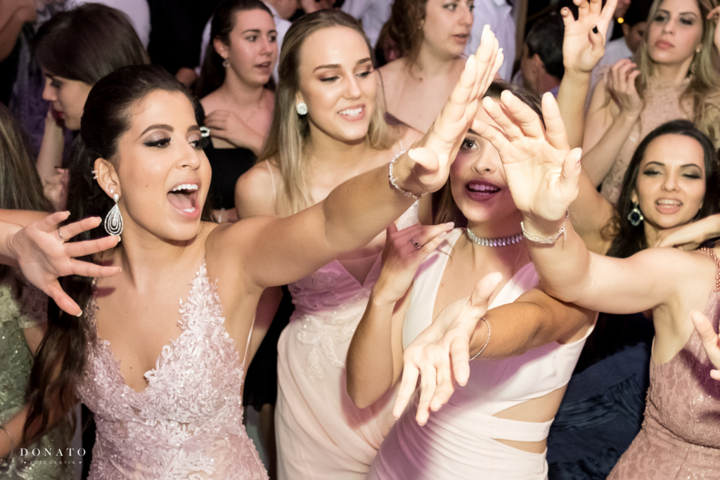 Na festa, fizemos nossa primeira dança, que havíamos ensaiado e que abriu a pista. Distribuímos rasteirinhas personalizadas para todas as convidadas, para que elas ficassem mais confortáveis, colocamos kits banheiro bem completos, fizemos todo mundo dançar muito na pista com uma equipe de Zumba que contratamos e depois refrescamos a galera com carrinho de sorvete.