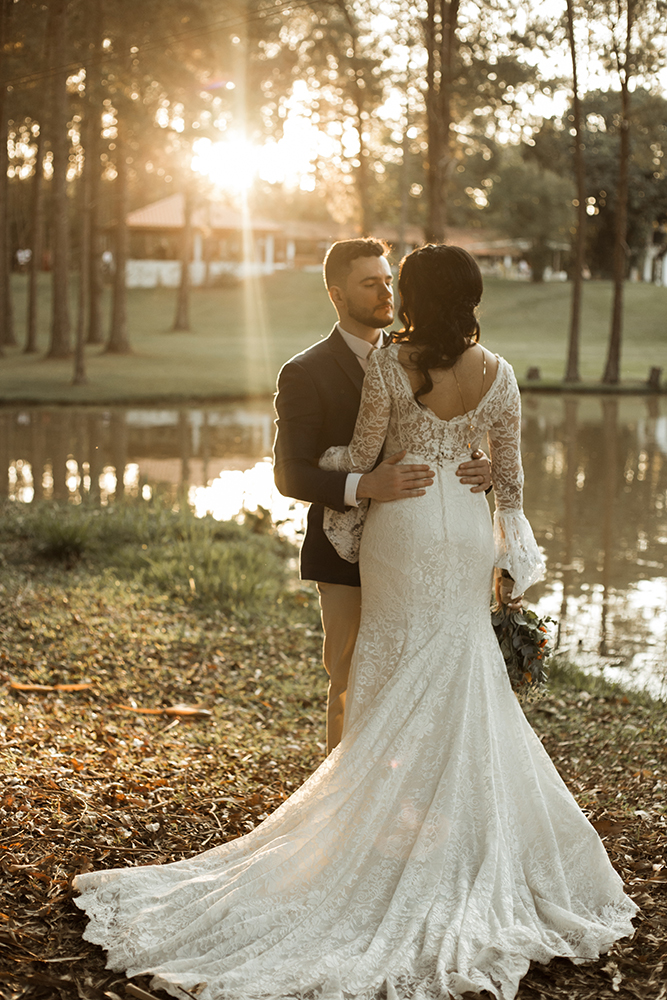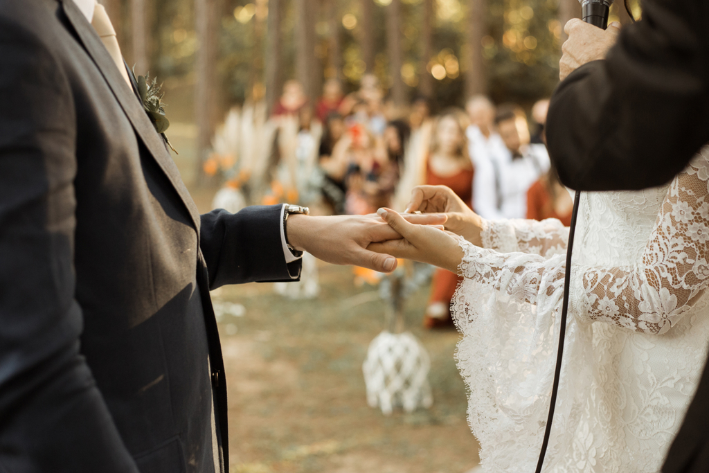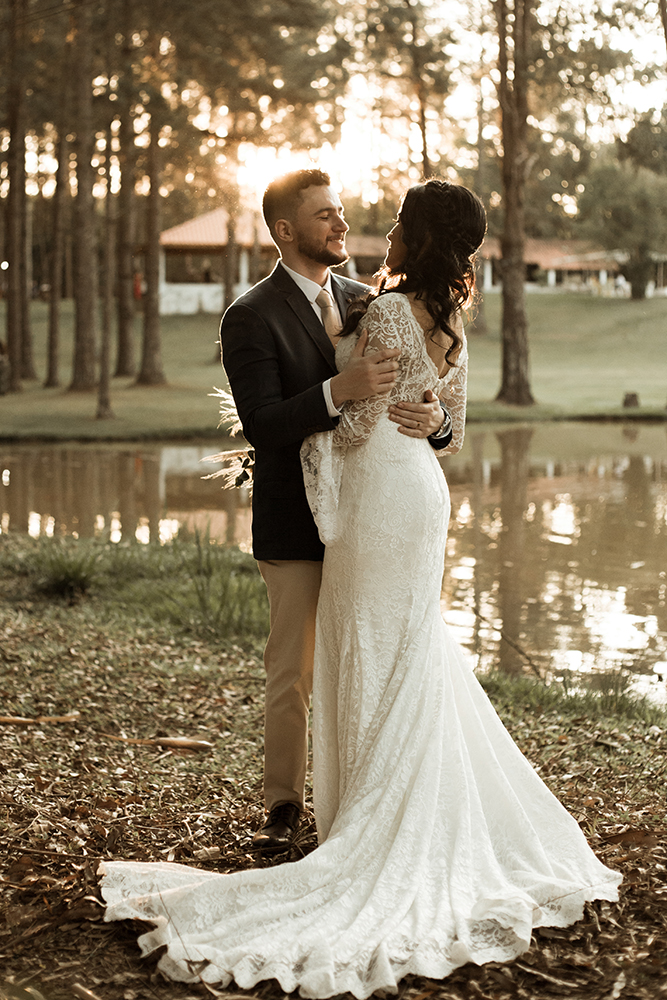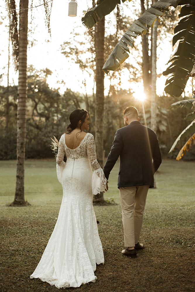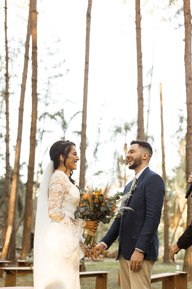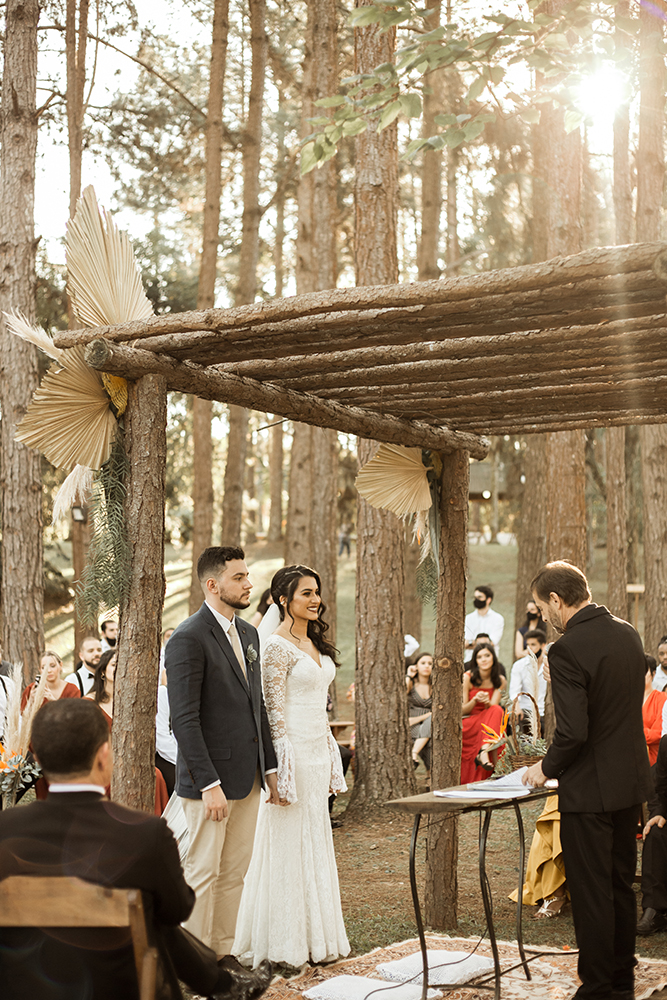 A troca de alianças seguiu o melhor do estilo boho. Ar livre, natureza, vestido de renda e outros detalhes especiais ditaram o clima alegre e descontraído. Tudo a ver com a energia do casal!