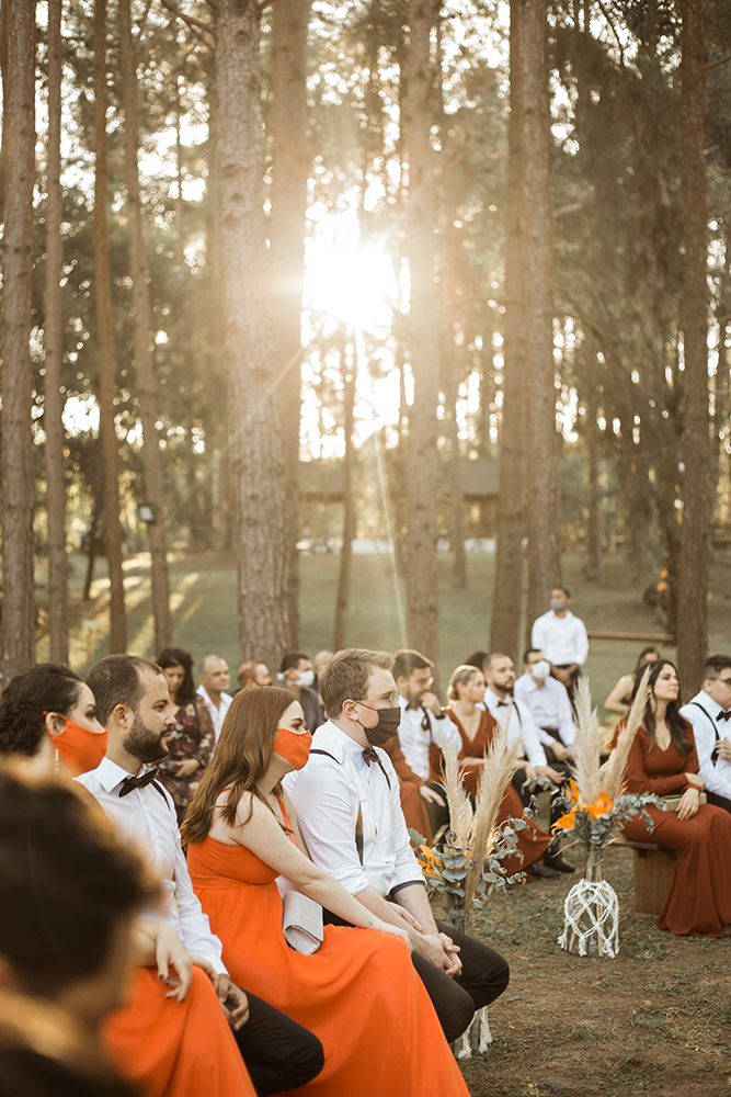 “No dia do casamento tivemos um momento engraçado e mágico. Tínhamos combinado que após a cerimônia não haveriam cumprimentos por conta do coronavírus. Pedimos aos padrinhos, pais e damas para irem saindo pelo corredor, formarem um círculo e ao redor deles, os convidados.