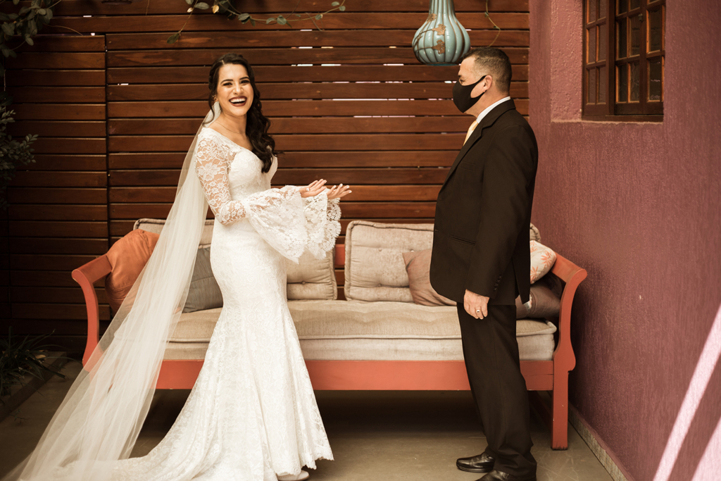 “No dia do casamento tivemos um momento engraçado e mágico. Tínhamos combinado que após a cerimônia não haveriam cumprimentos por conta do coronavírus. Pedimos aos padrinhos, pais e damas para irem saindo pelo corredor, formarem um círculo e ao redor deles, os convidados.