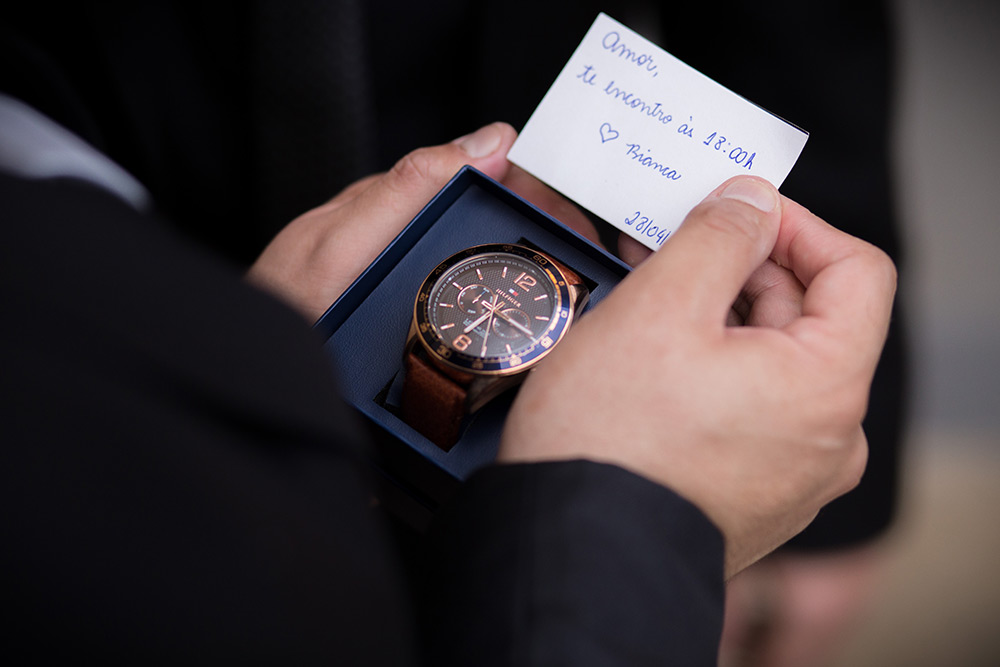Os cliques ainda mostram o making of em família, sem esquecer o noivo emotivo ao receber um presente da futura esposa. Fica a dica: surpreender seu par pouco antes do SIM rende lágrimas e sorrisos!
