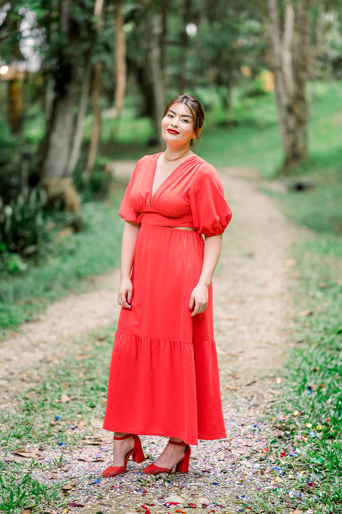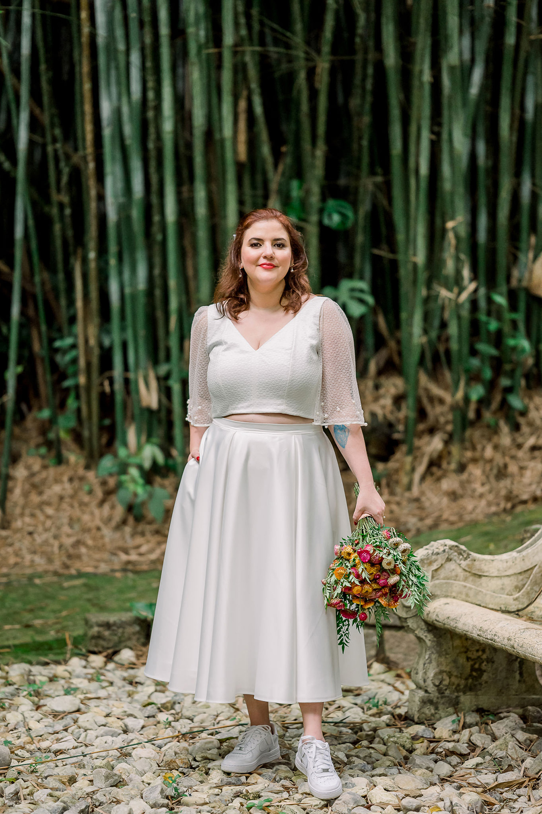 O modelo de duas peças – cropped e saia midi – me deixou à vontade, leve e feliz.
