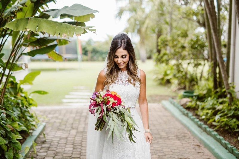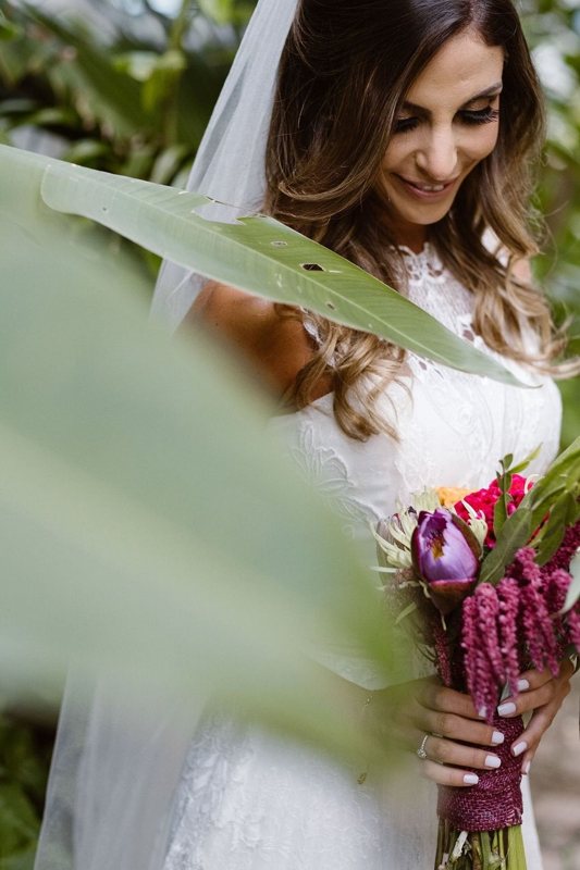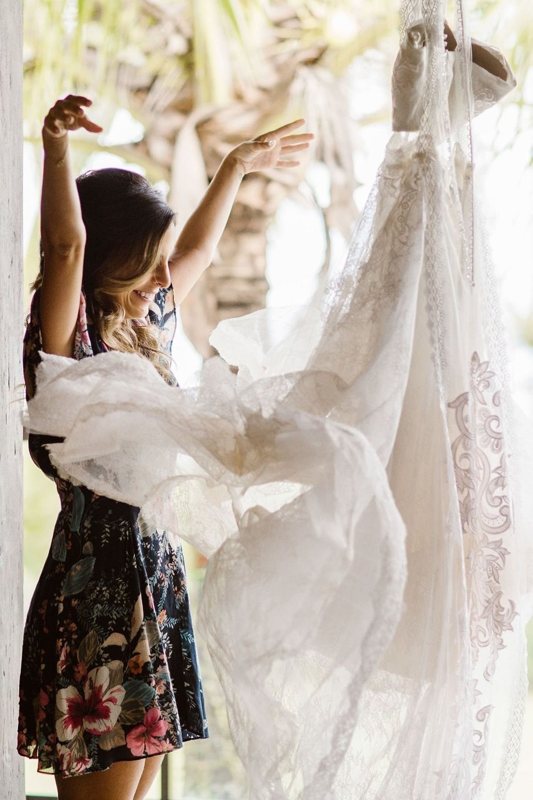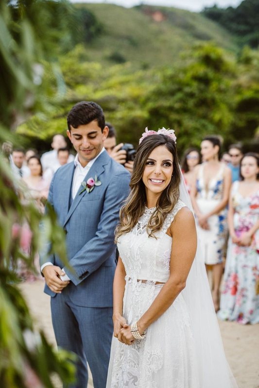 A Bruna ficou linda com cabelo solto, maquiagem leve, vestido YolanCris e véu. Uma noiva alinhada com a ideia de casamento na praia, mas ao mesmo tempo romântica e delicada.