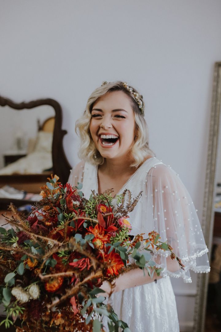 Bruna usou um lindo vestido com aplicação de pérolas e ficou radiante com o buquê em tons terrosos.