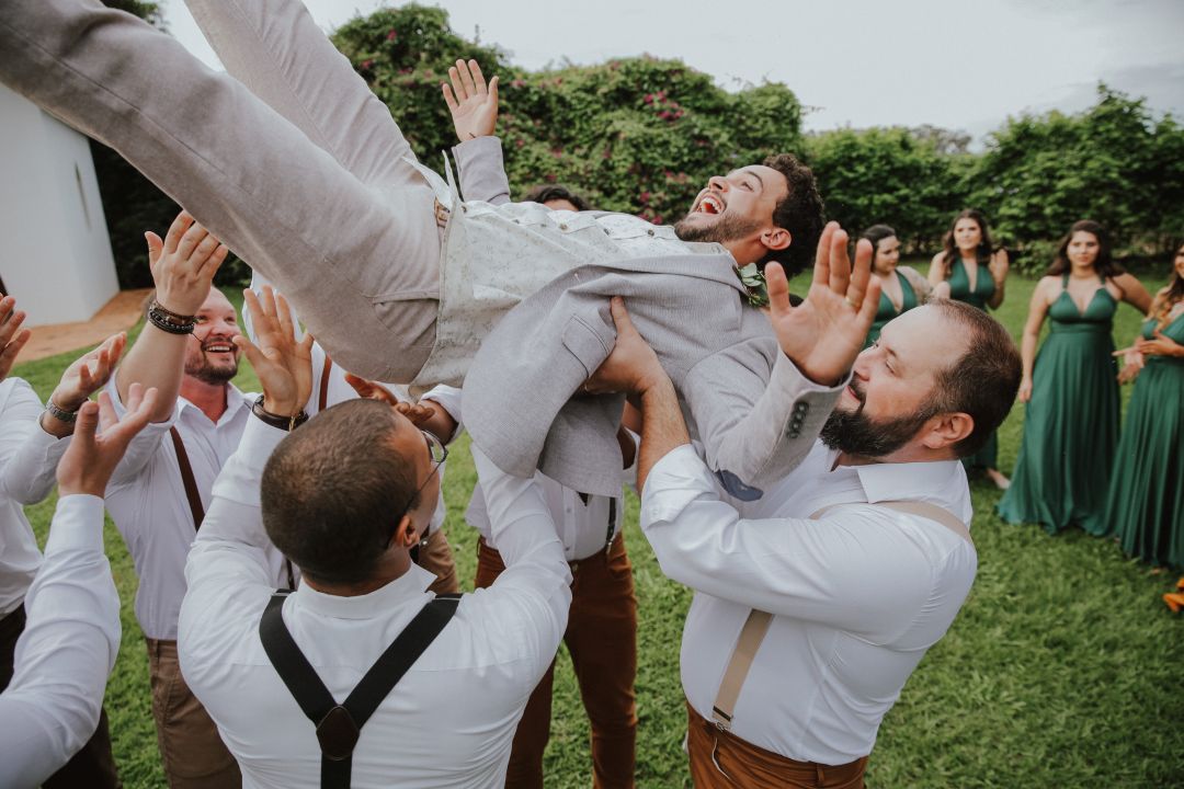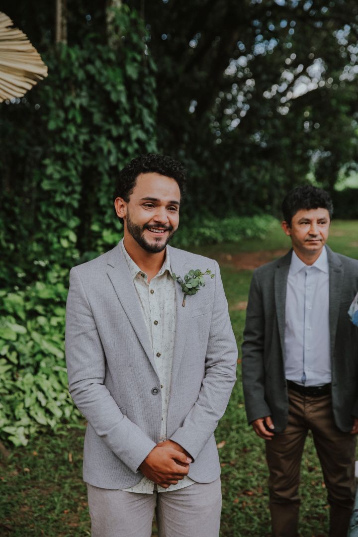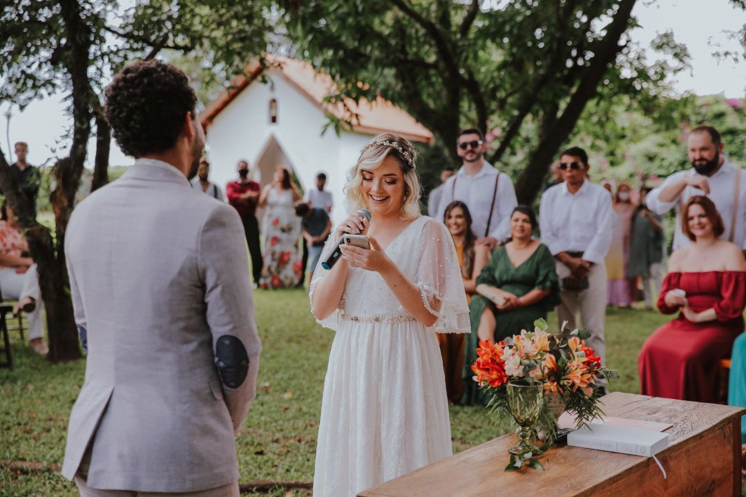 A cerimônia foi ao ar livre, em um espaço verde e cheio de arvores. O jantar estava delicioso, toda a equipe funcionando e servindo da melhor forma, e a decoração surpreendentemente incrível! Esse dia e toda a equipe envolvida conseguiram superar nossas expectativas!”.