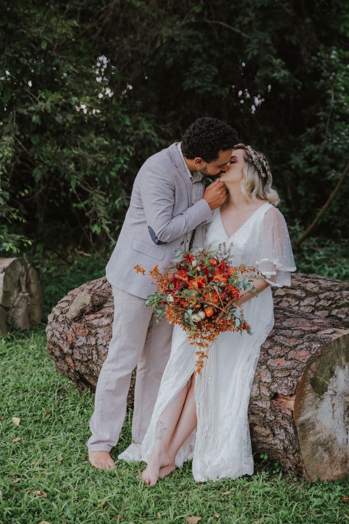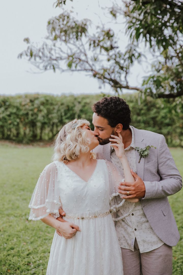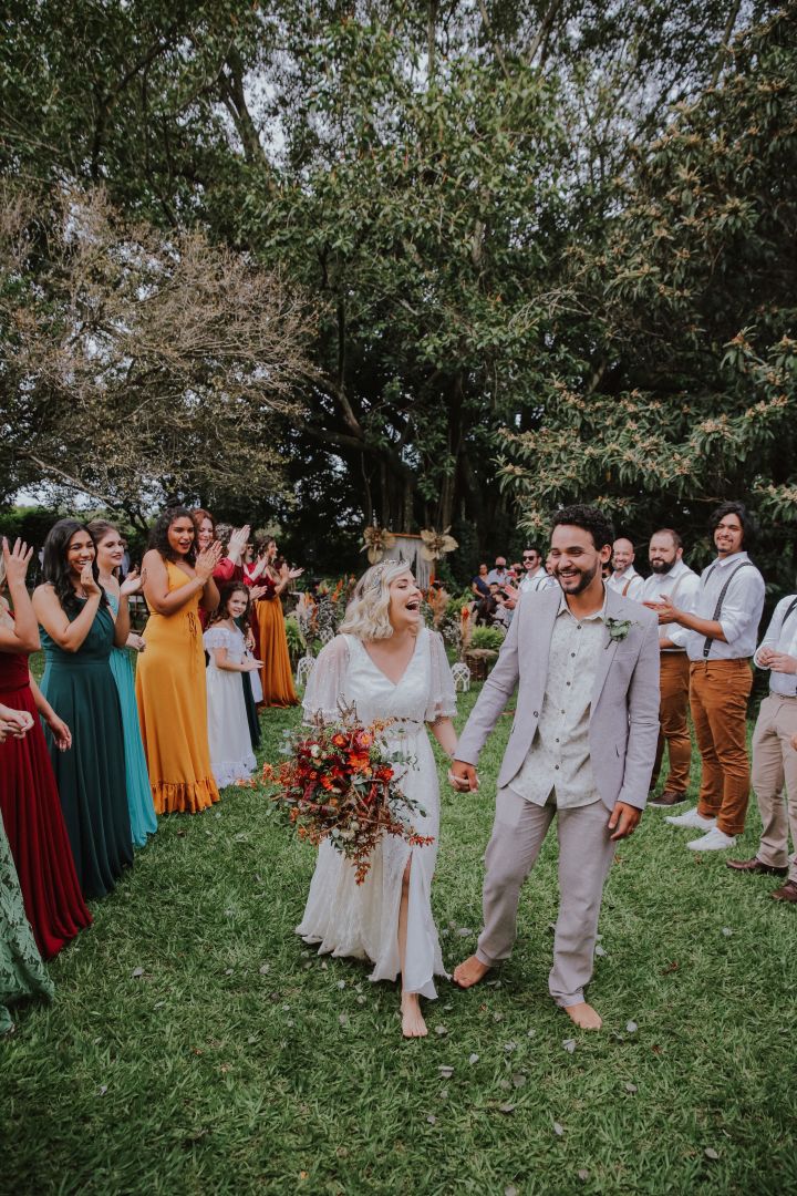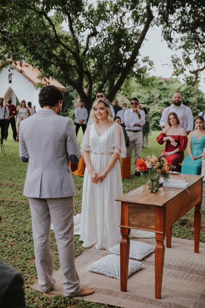A cerimônia ao pé da árvore, com macramês espalhados pela decoração, é dessas que deixam a gente suspirando.