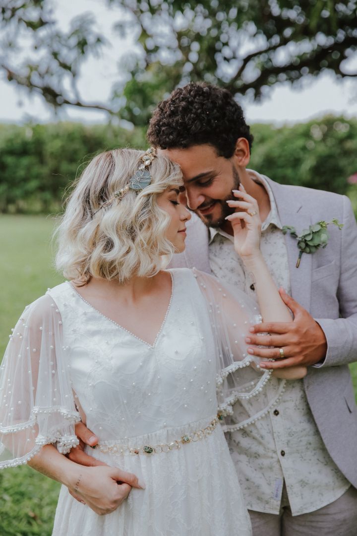 Formada em moda, a noiva idealizou a peça que gostaria de usar. Depois de não encontrar nada parecido, colocou a mão na massa. A partir daí nasceu a Bruna Janoski Ateliê, marca dedicada a embelezar noivas para o grande dia.