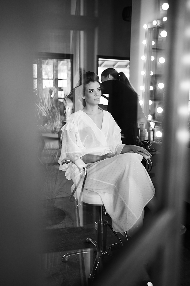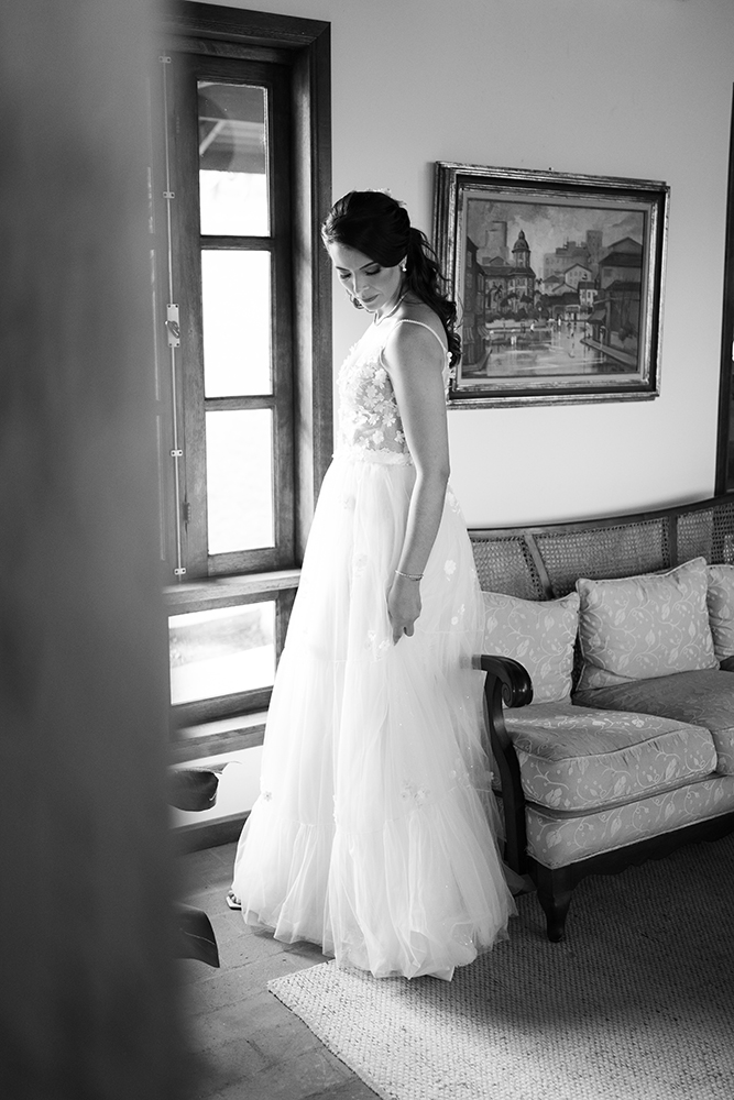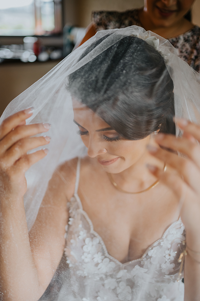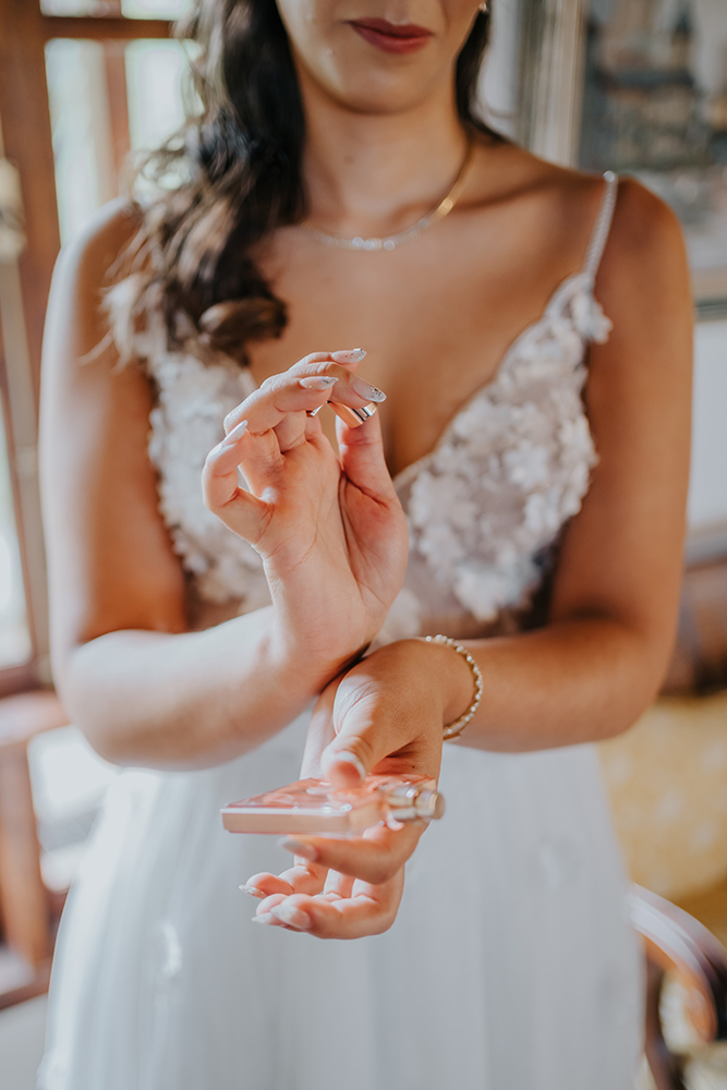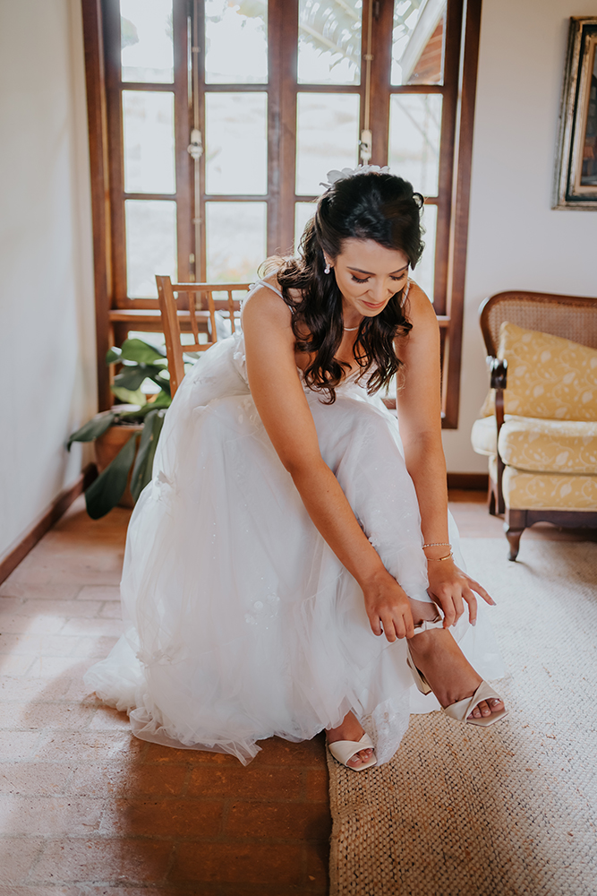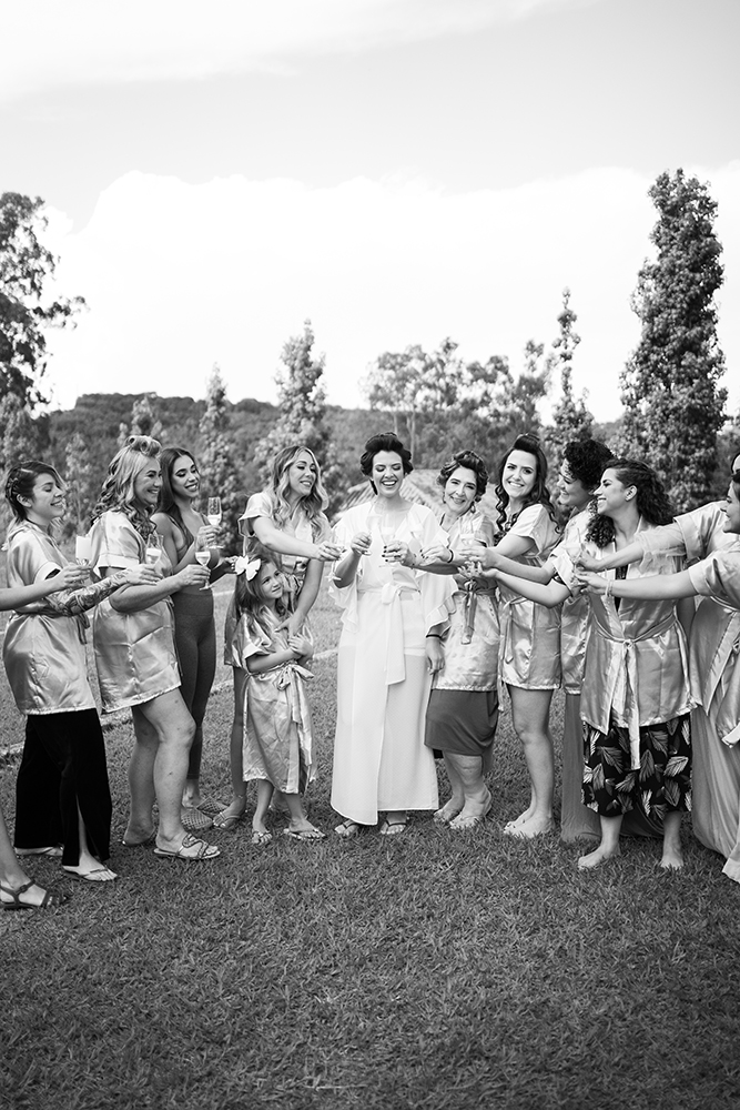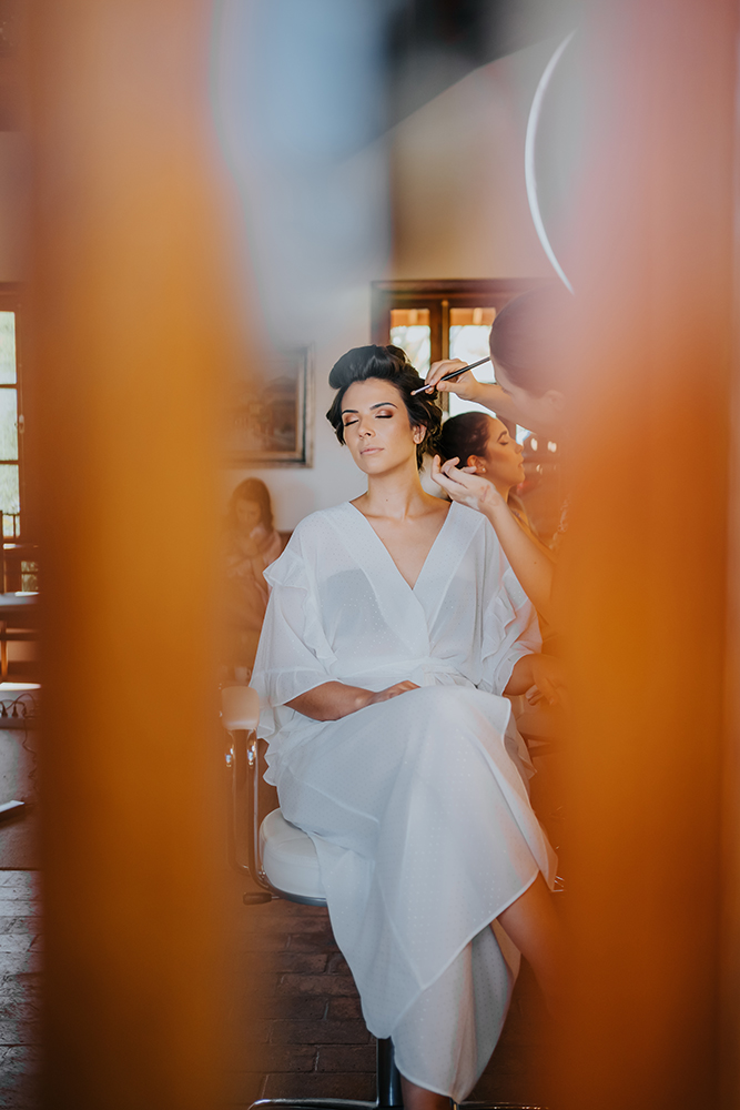 Com o tempo já conseguia visualizar o casamento tomando forma, mas ainda não sabia muito bem o que queria para cabelo e make, e aí encontrei minha anja Marina, que fez um dia inteiro de prova de beleza para que eu mudasse tudo no dia, rs. Confiei no trabalho dela e fui guiando detalhe a detalhe e adorei o resultado. Escolher bem a pessoa da maquiagem e a equipe que foi produzir minhas madrinhas foi essencial! No dia estava muito tranquila com um ambiente descontraído e leve.