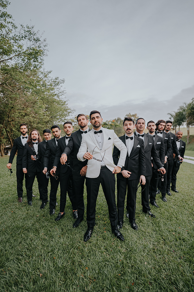 Um investimento muito assertivo foi na nossa equipe de fotografia e filmagem! Nos sentimos muito à vontade, eles já nos conheciam do pré wedding e tudo fluiu de maneira muito leve e gostosa. Como havia amado de paixão nossas fotos de óculos escuros no ensaio, compramos mais uma dúzia e levamos ao casamento para tirar fotos com nossos padrinhos.