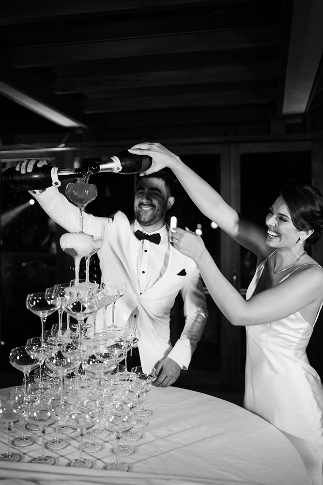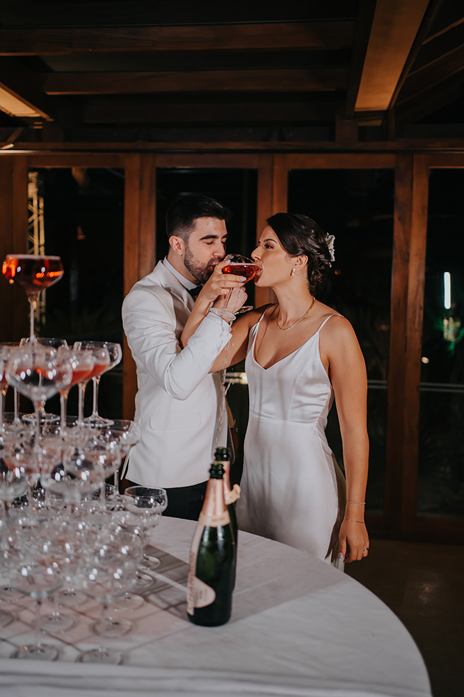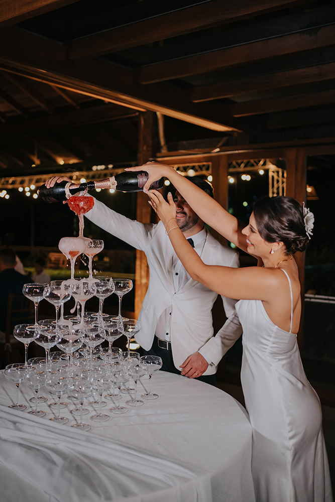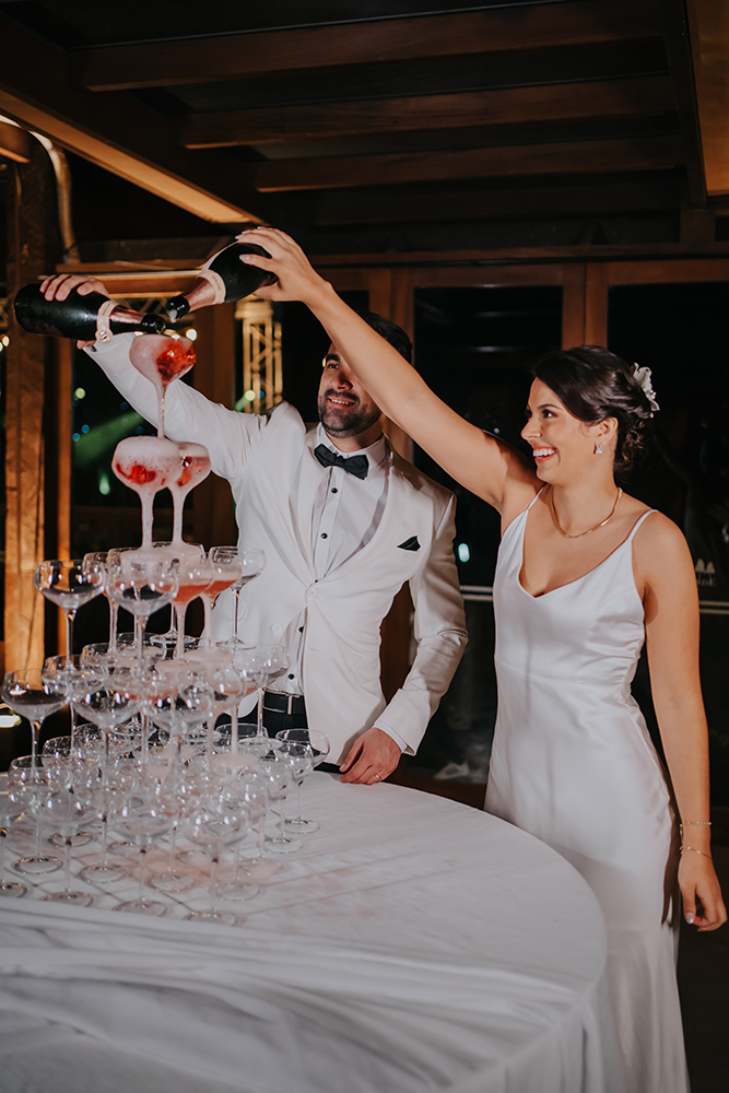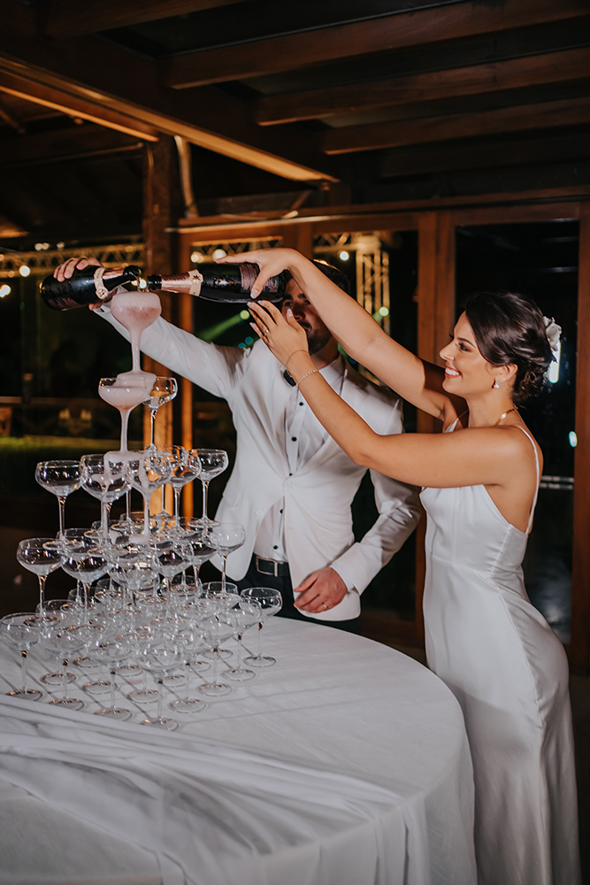 O buffet tradicional, por exemplo, foi substituído por pizza. Sem contar a torre de taças e a mesa de bolo clean, tudo em perfeita sintonia com a essência dos noivos.