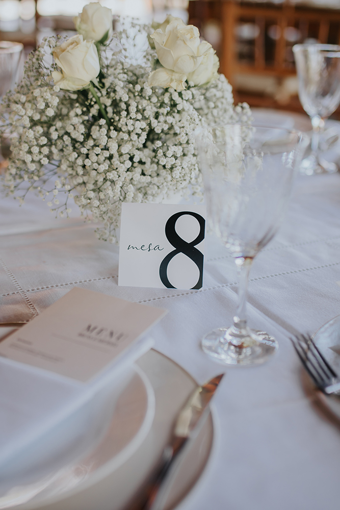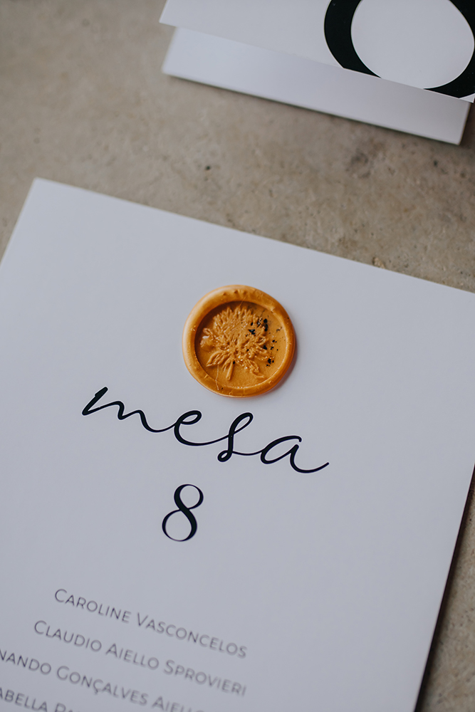 Fiz todo o projeto de papelaria com meu amigo designer Lucas Siman. Criamos o convite, plaquinhas de mesas, numeração das mesas, menu, placa de boas-vindas… Enfim, tudo com a mesma linguagem clássica e simples. Os selos de cera dos convites e das mesas foram feitos pela minha melhor amiga e madrinha, Bruna.
