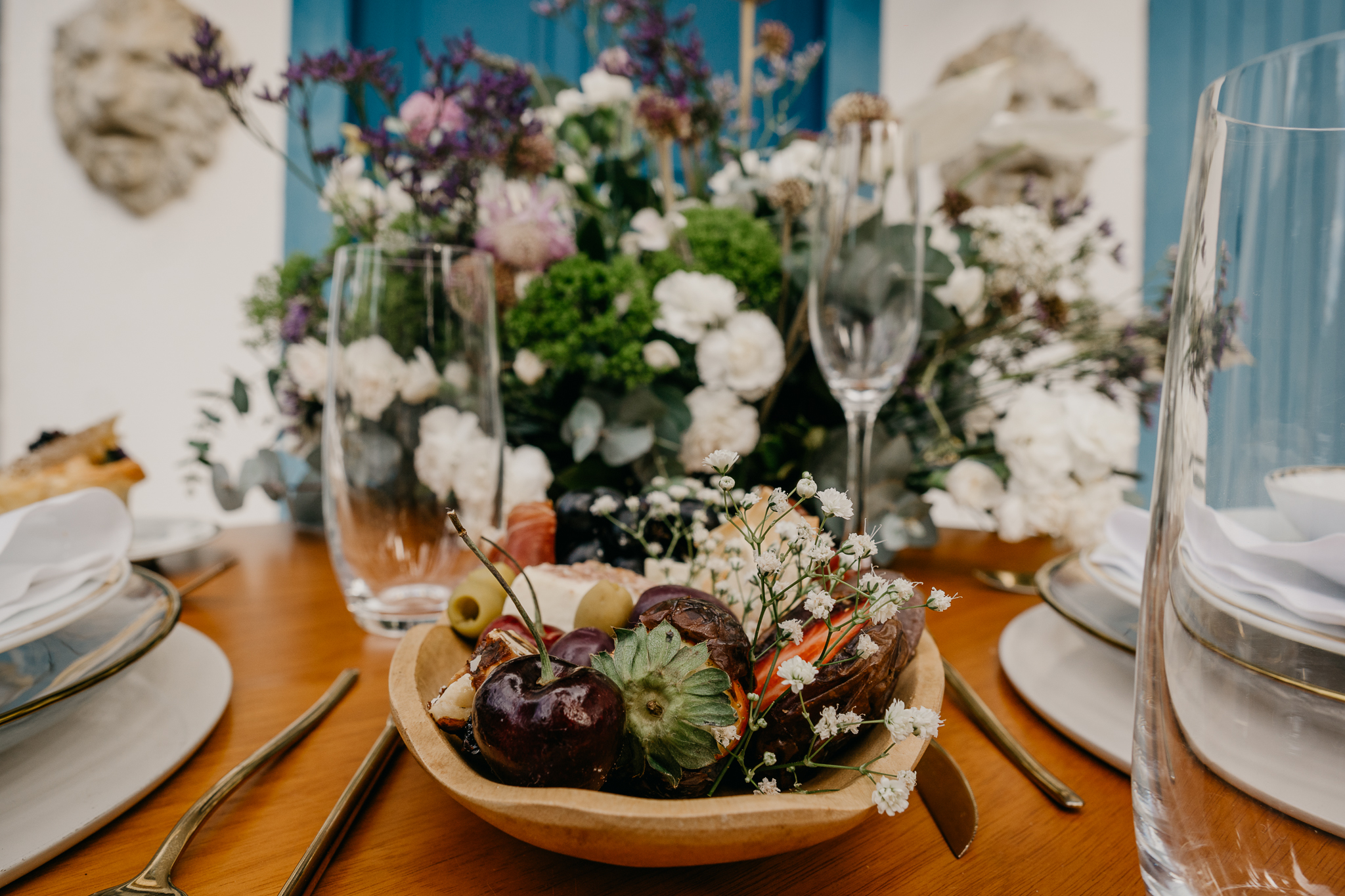 - Grazing table (seleção de azeitonas, queijo Santo Casamenteiro, Pata Negra, morango com tâmaras frescas, cerejas, uvas negras e palha italiana)