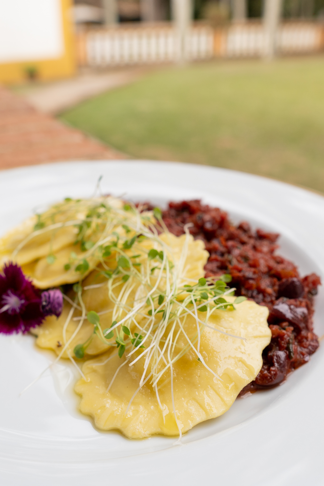 - Ravióli de bacalhau acompanhado de molho de azeitonas pretas
