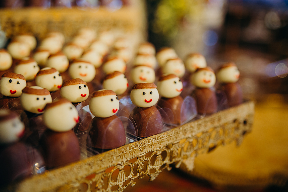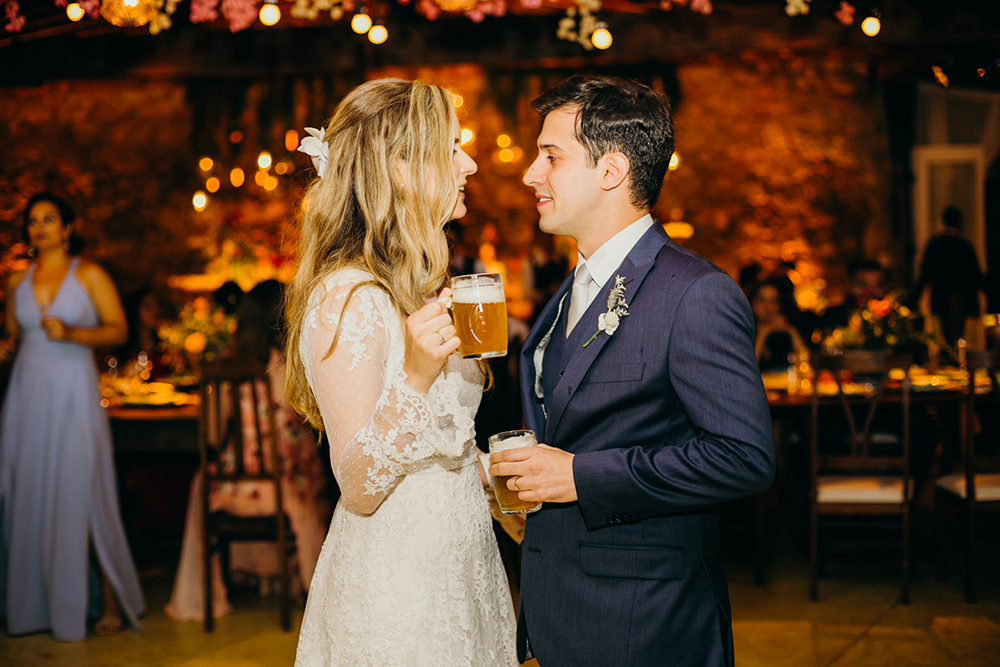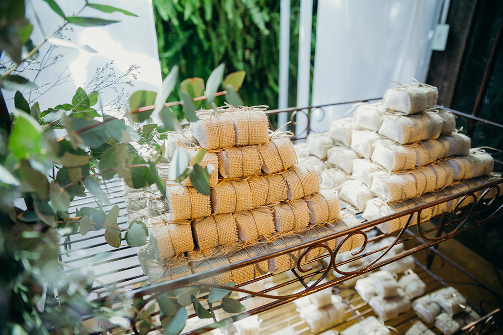 Sempre gostei do estilo boho, e queria que cada detalhe contasse uma história. Para as lembrancinhas dos padrinhos demos uma cerveja artesanal feita especialmente para nós por um dos padrinhos, com a aquarela feita com uma foto nossa no ensaio do casamento religioso no rótulo (essa aquarela estava também na decoração e hoje fica em cima da nossa cama), e demos um doce de leite que eu amo e uma goiabada que o Douglas ama em potinhos personalizados com as orquídeas, bem mineirinhos.