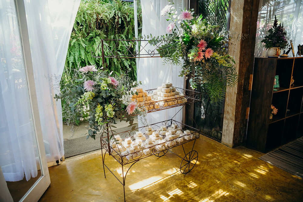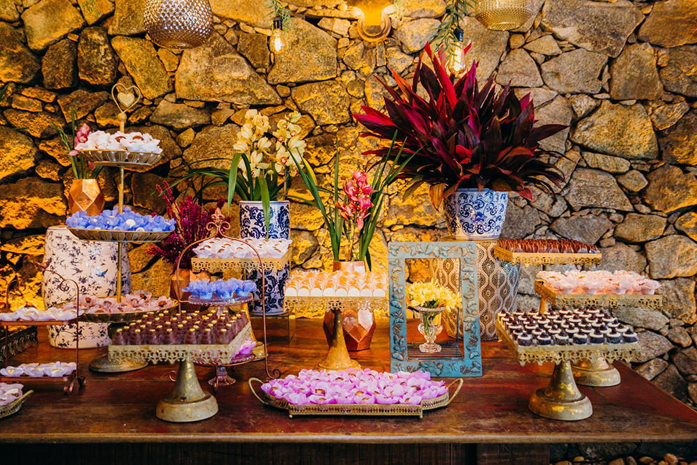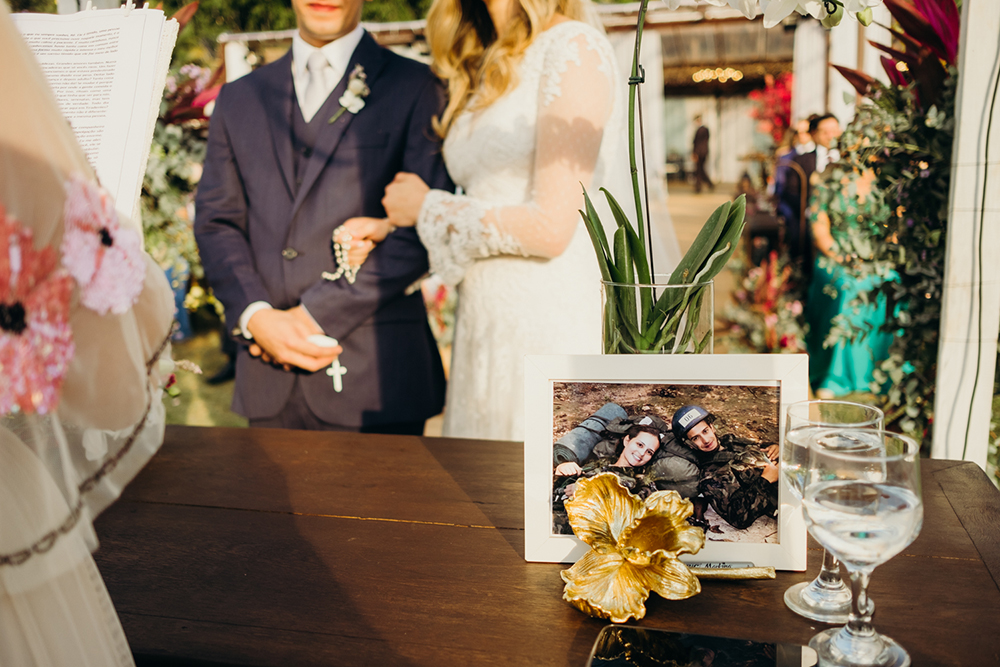 “Escolhi cada detalhe da decoração e da arte visual e decidi que o tema principal do convite seria uma orquídea. Sonhei que meu sogro me dava essa orquídea dias depois de sua partida. Seria a nossa forma de ter ele bem presente nesse momento. Até o arranjo do meu cabelo foi feito com a mesma orquídea”, conta a noiva.