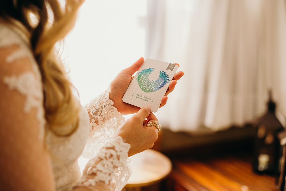 E enfim chegou o dia 27/04. Momentos antes da entrada eu estava super calma com minha mãe, minha irmã e cunhadas, e a celebrante leu um poema lindo que já me emocionou muito e me pediu para tirar uma carta que guiaria a cerimônia – onde os braços viram