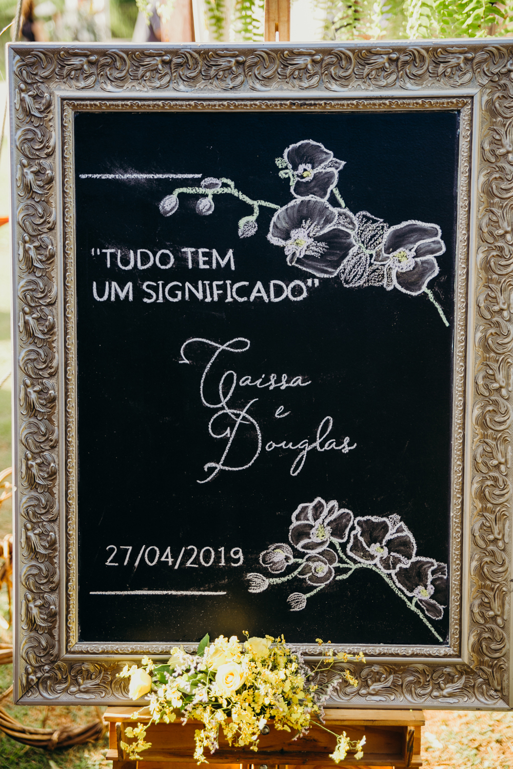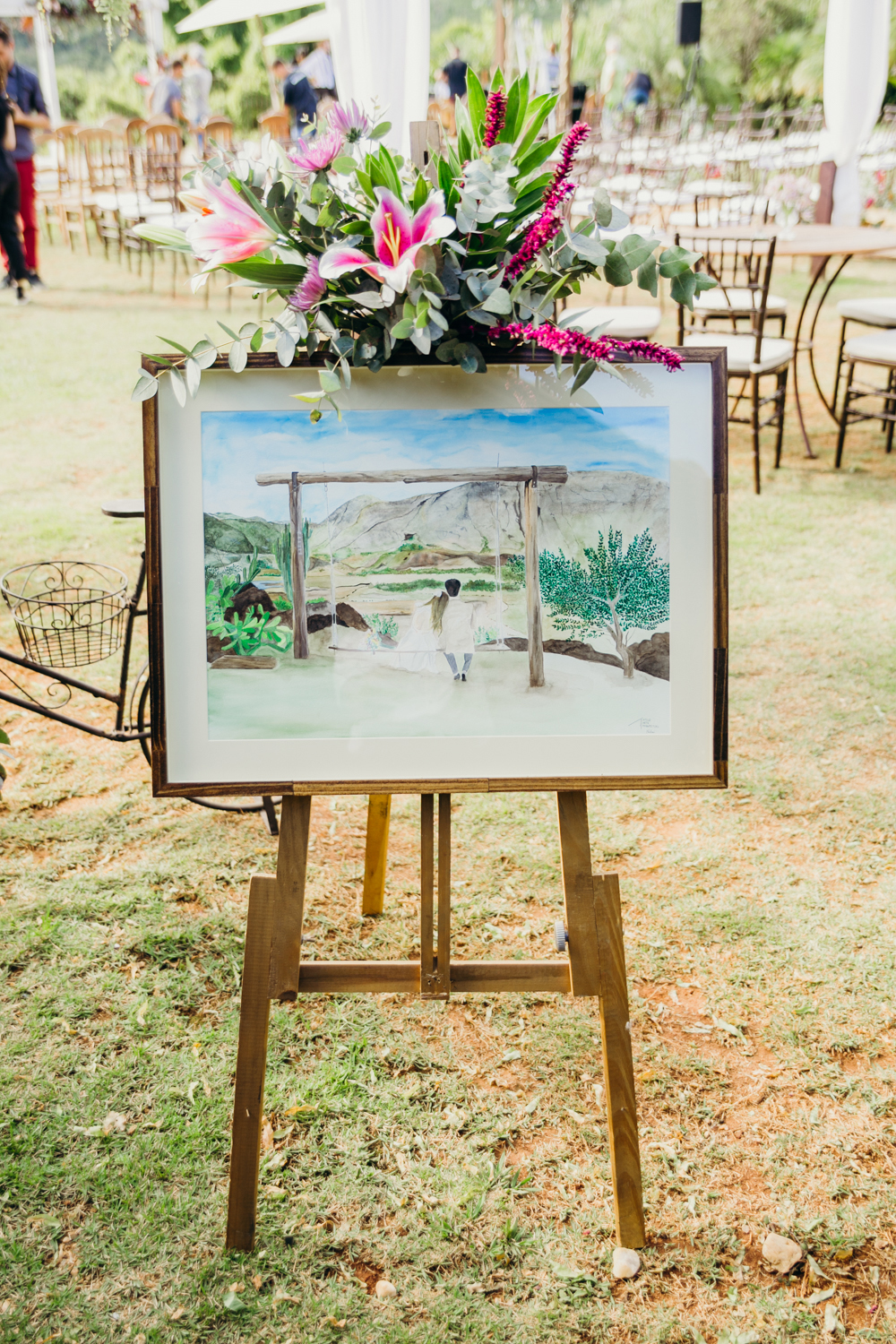 Comecei a escolher os fornecedores em 2017 e uma das primeiras que escolhi foi a celebrante a Renata do Conto de Vista, eu havia visto a história do casamento dela cheia de significados e me identifiquei muito. Escolhi cada detalhe da decoração e da arte visual e decidi que o tema principal do convite seria uma orquídea que eu havia sonhado que meu sogro me dava dias depois da sua partida. Seria a nossa forma de ter ele bem presente nesse momento. Até o arranjo do meu cabelo foi feito com a mesma orquídea.
