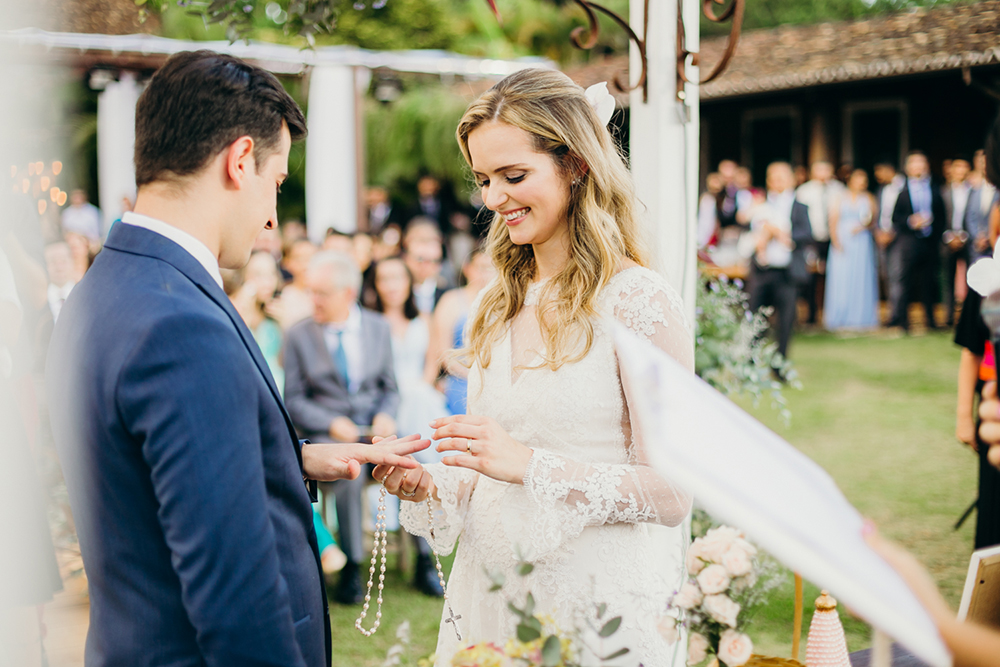 asas – e eu rezava… Quando começou a nossa música (Carinhoso, a mesma que ele cantou no pedido de casamento) e eu entrei de braços dados com meu pai, vi tudo tão lindo… Acho que nunca havia visto um céu tão azul e um sol tão brilhante, as pessoas que mais amamos nos olhavam com olhares tão aconchegantes e meu noivo com aquele sorriso meio de lado que conheço tão bem e os olhos brilhando ainda mais que o sol.Naquele momento tive a certeza de que lembraria desse dia como um dos mais felizes da minha vida.
