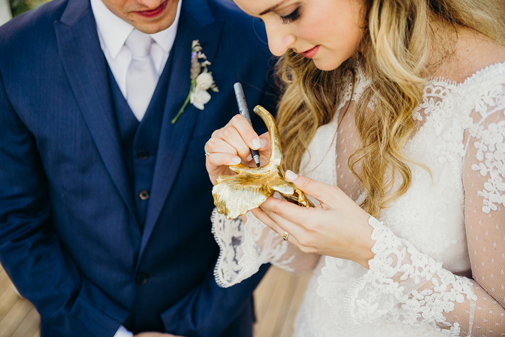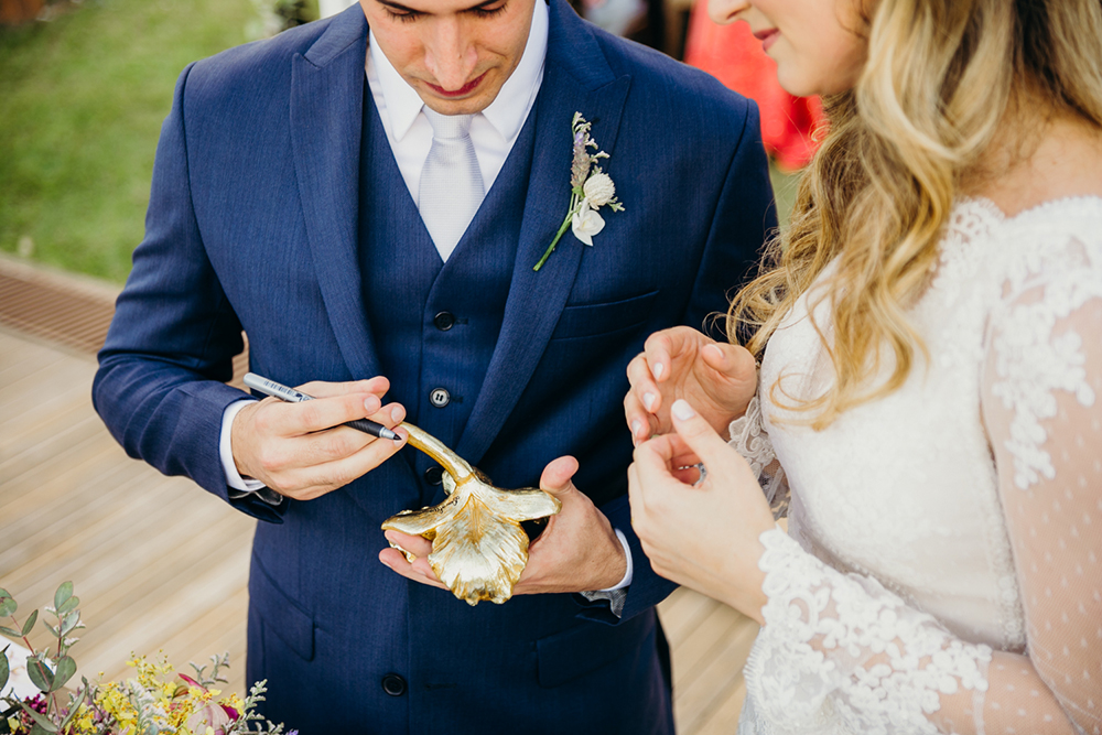 A cerimônia foi linda, nossa celebrante sempre dá um nome ao casal e o nosso foi ‘a bailarina e o soldadinho de chumbo’. A assinatura foi feita em uma orquídea dourada que ela nos deu. Na entrada das alianças meu pai tocou sax com minha irmã (a pessoa mais tímida do mundo) cantando…