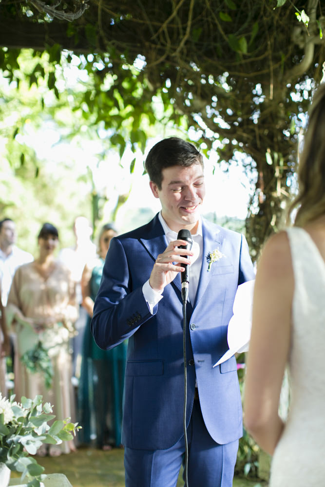 A cerimônia foi inteira muito emocionante, pois foi celebrada por algumas pessoas: nosso melhor amigo, nossa melhor amiga e meu pai no final. Meu irmão (que nos apresentou no início) levou as alianças pra gente e todo mundo caiu no choro!