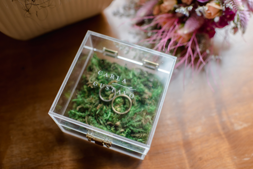 “Devido a pandemia tivemos que reagendar o casamento duas vezes. Nesse meio tempo mudamos de ideia e fizemos uma cerimônia bem íntima e segura, para 18 convidados.