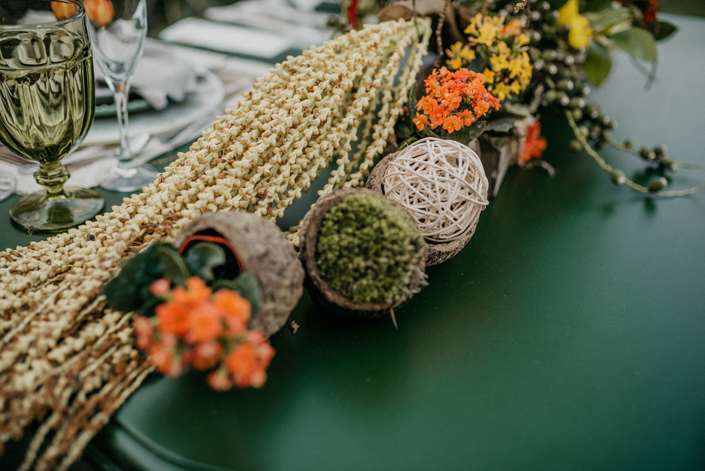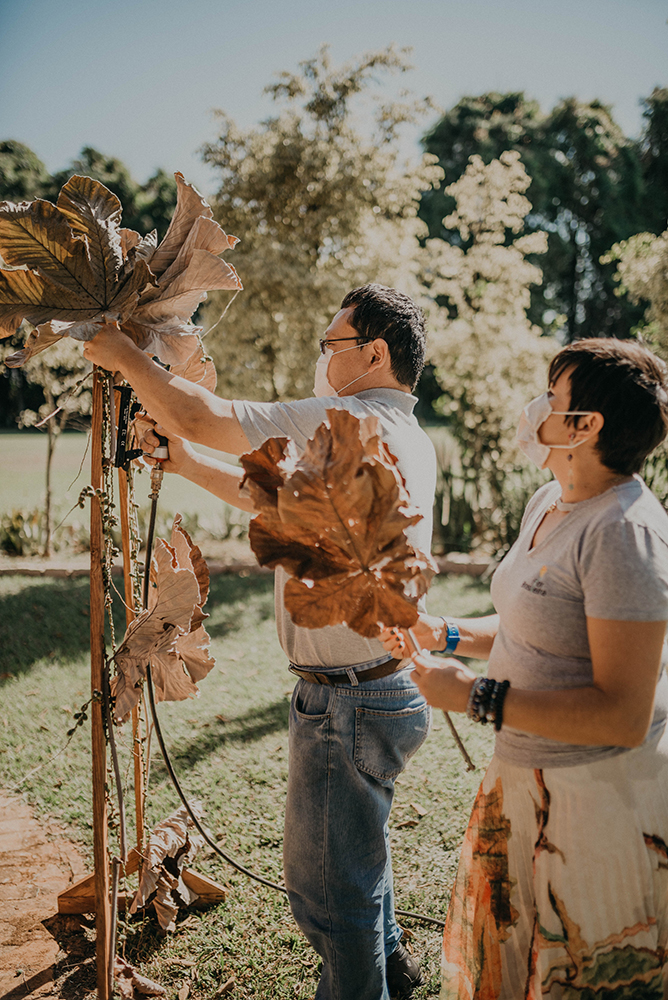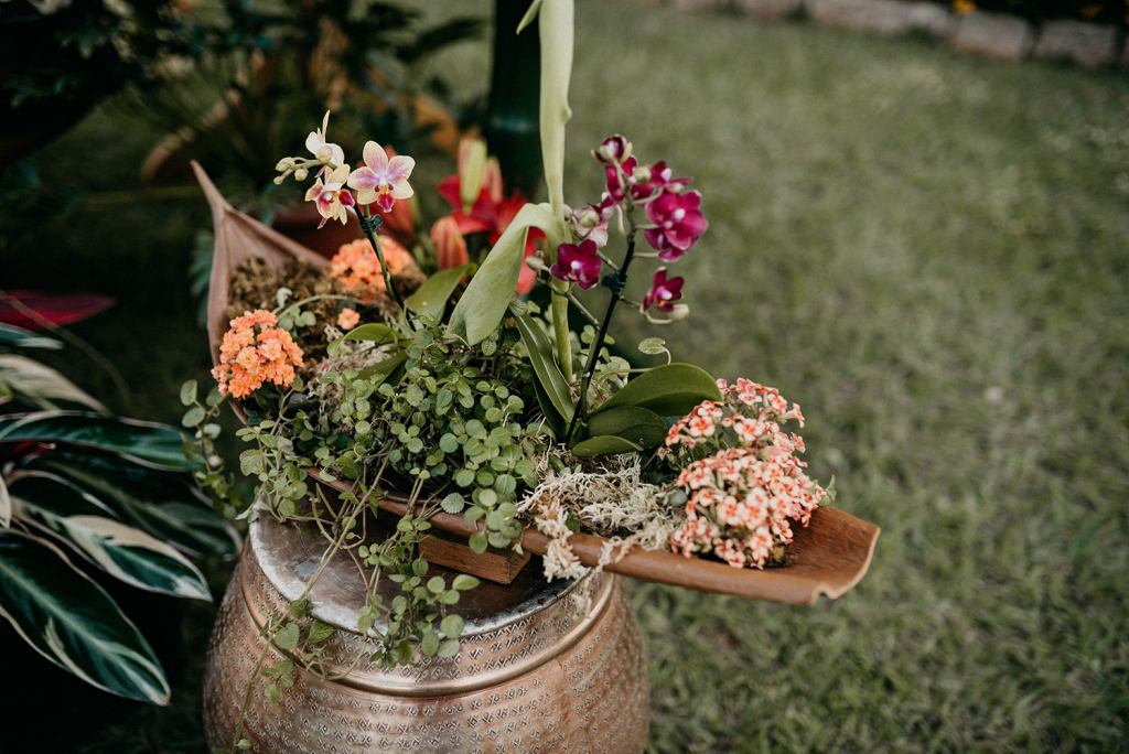 Tudo criou vida com as cores da decoração da Flor Brasileira. Certamente, uma decoração cheia de sensibilidade, em tons terrosos e românticos, plantas e flores enraizadas em seus vasos, folhas que um dia foram verdes mas hoje secas e caídas no chão foram recolhidas com todo cuidado por essas artistas e passaram a decorar o altar do nosso sonho. Alinhada a toda a arte floral tivemos também a participação do Ateliê Pruda com seus lindos painéis em madeira, os móveis fantásticos da Márcia Locações e a iluminação que trouxe um charme todo especial do Letreiro Neon e do Gago Produções quando o sol nos deixou”.