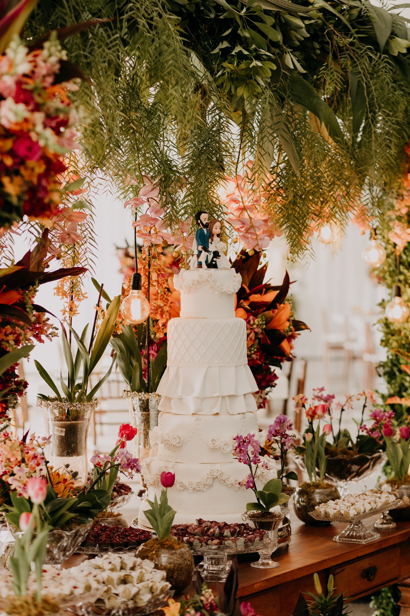 Enquanto a nave e ao altar foram decorados com varal de lâmpadas e flores brancas, a festa ganhou cores vivas, incluindo laranja e marsala, sem contar as orquídeas pink.