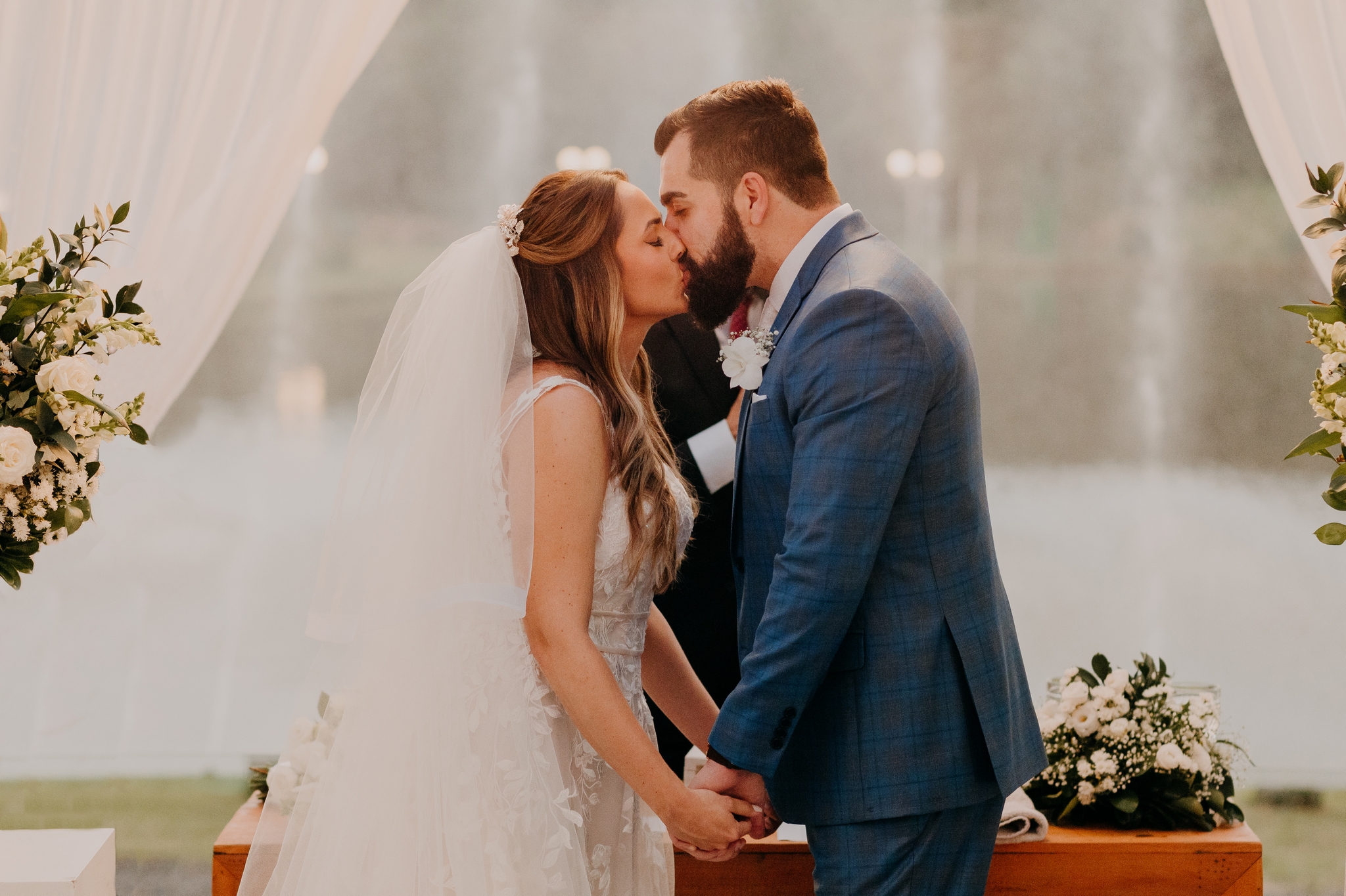 Outros destaques são os trajes escolhidos pelo casal. Ele de terno azul, ela de vestido rendado. Ambos lindíssimos!