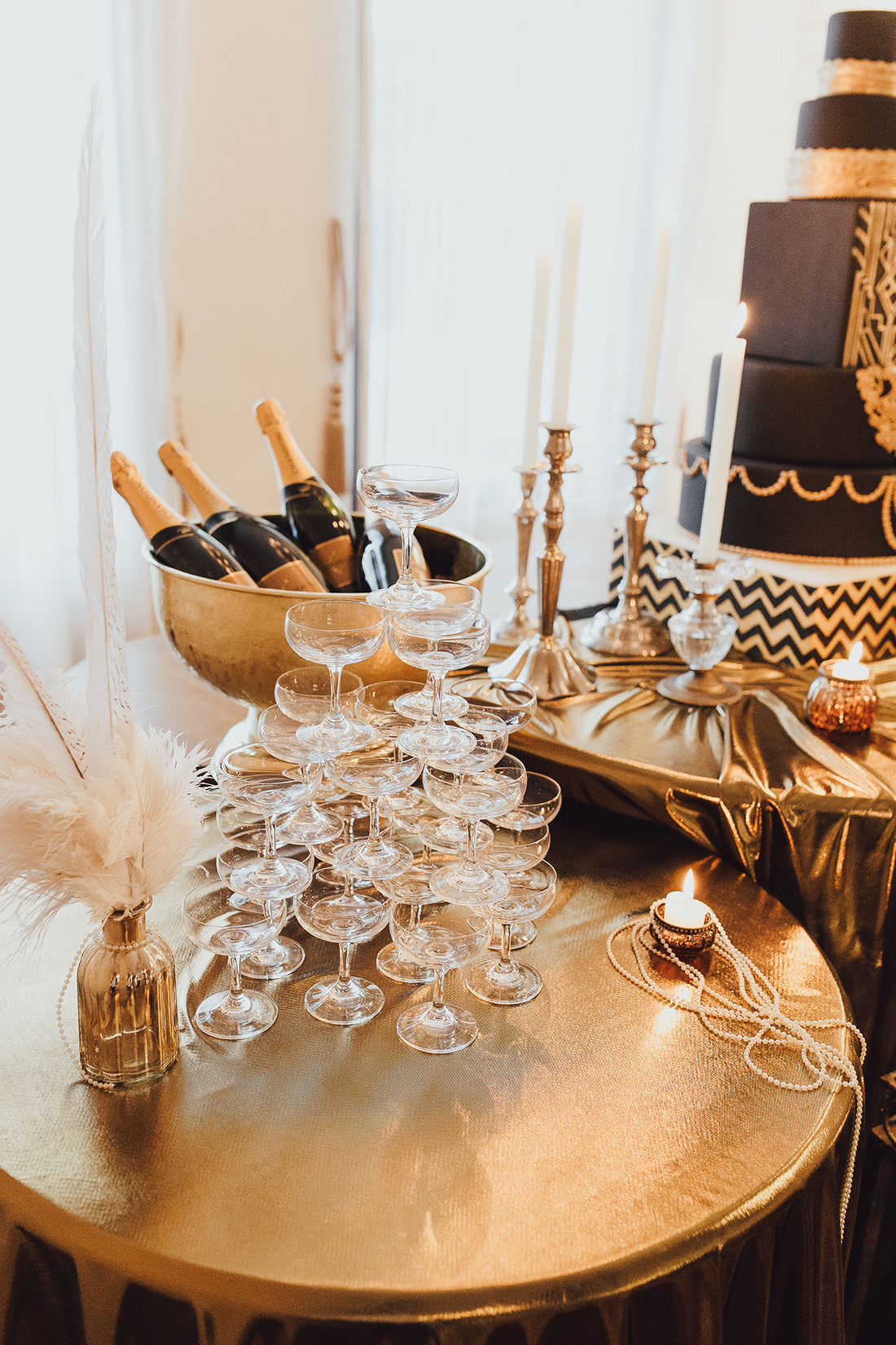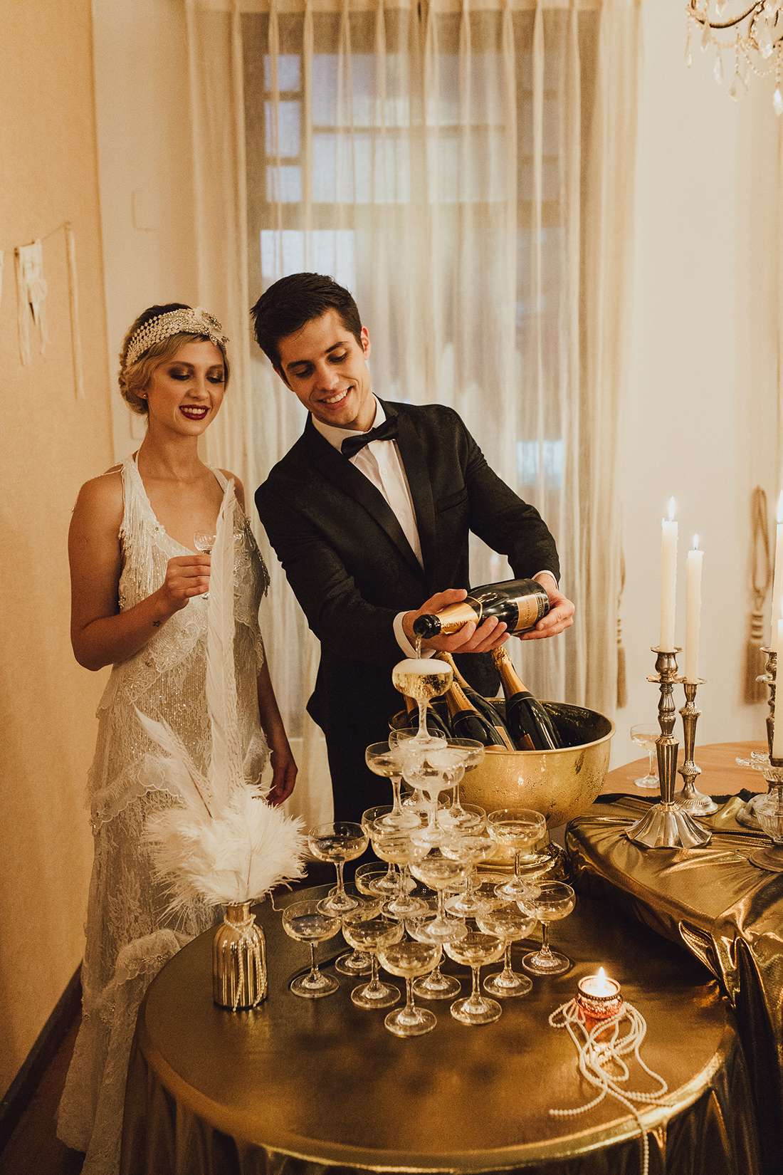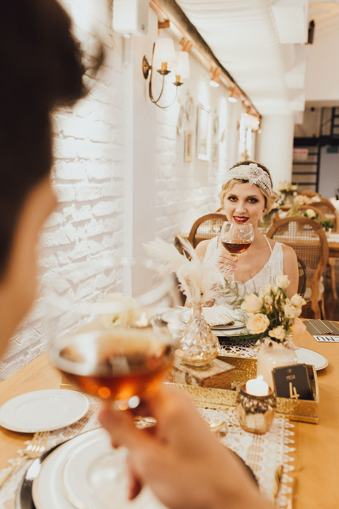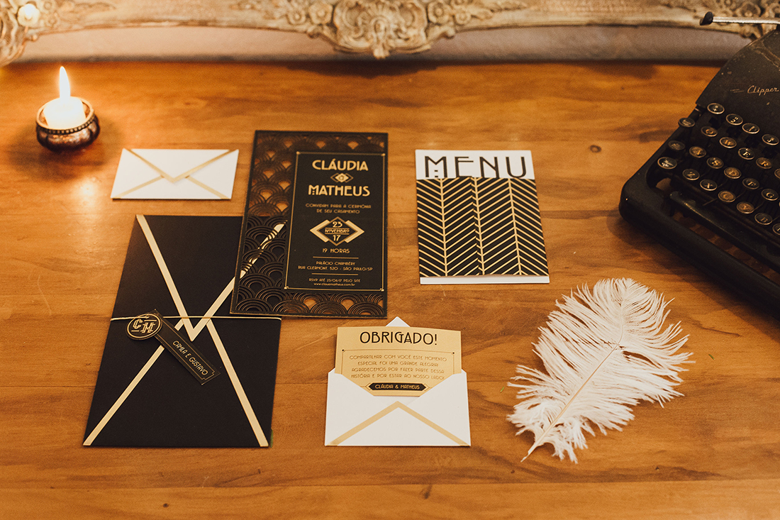 Na minha versão, além de taças de cristal, acessórios dourados e muito glamour, a pegada anos 20 foi trazida para os dias atuais. Conseguimos sair do clichê, afinal, a ideia é servir de referência para casamentos contemporâneos.