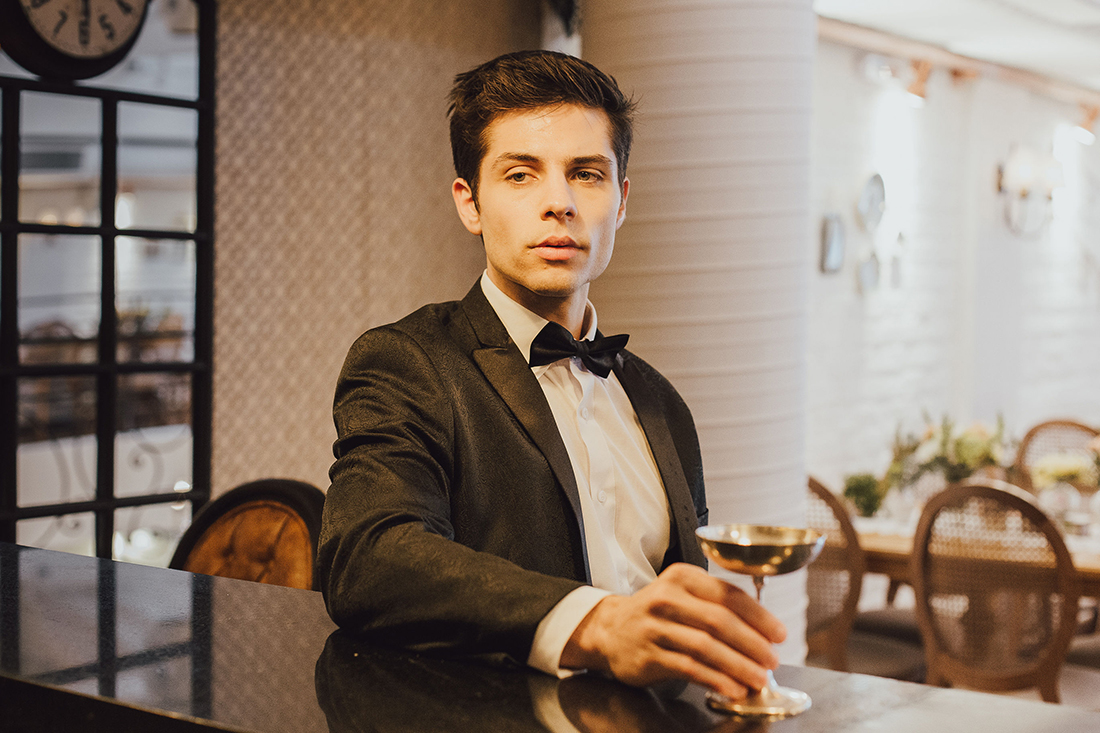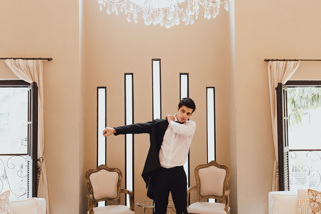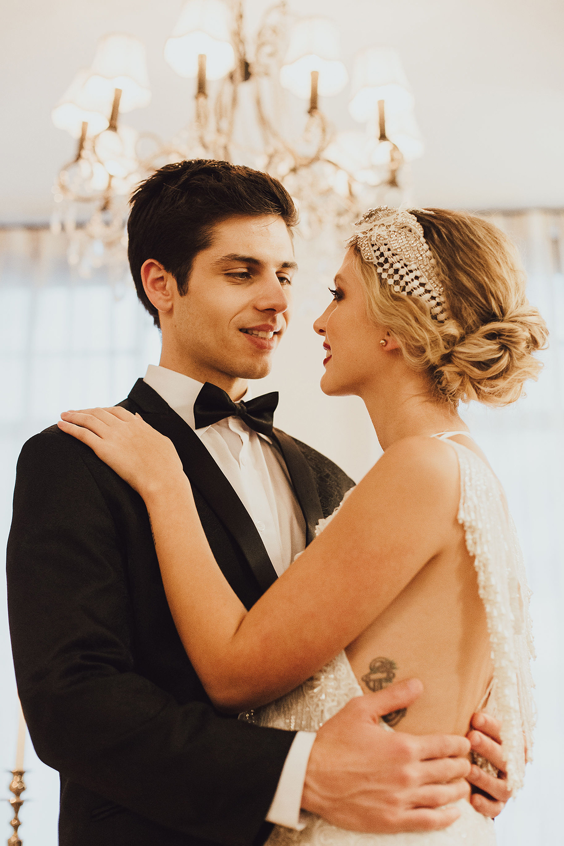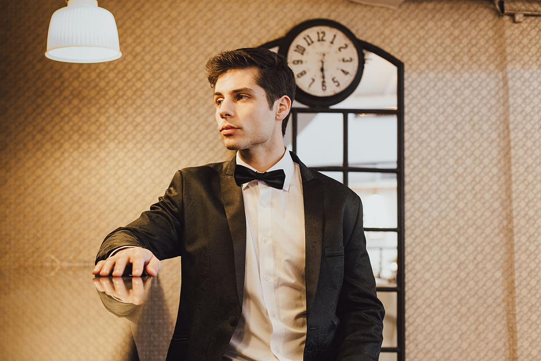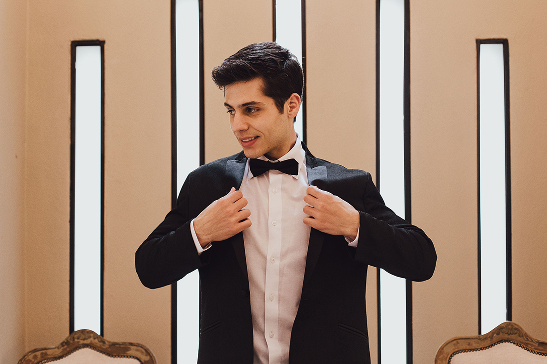 O CASAMENTO ANOS 20 traz um noivo charmoso, com smoking e gravata borboleta.