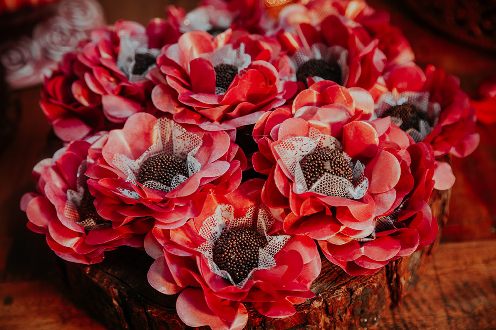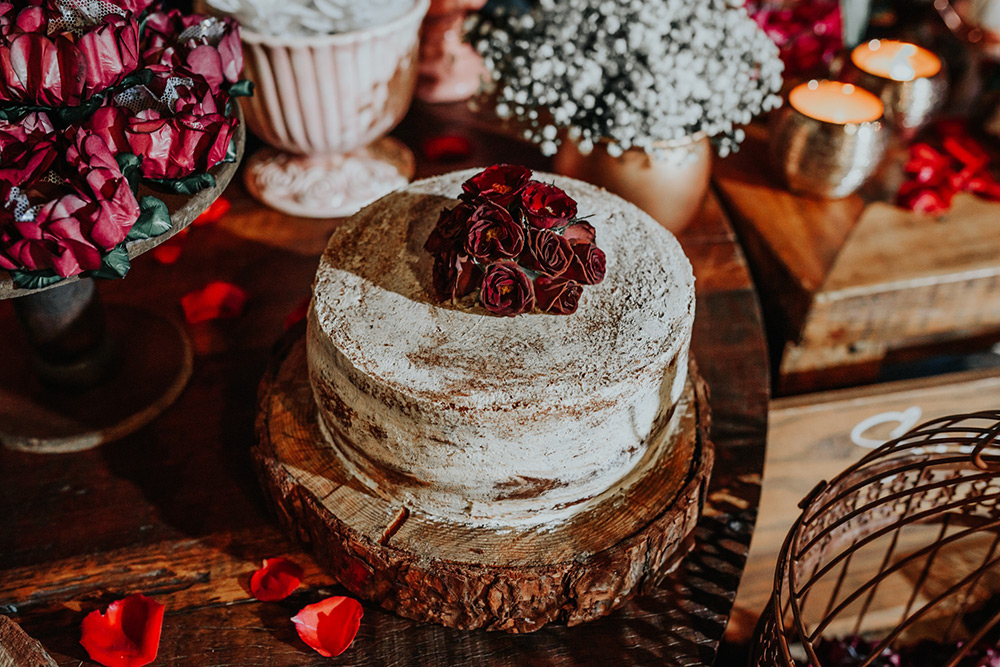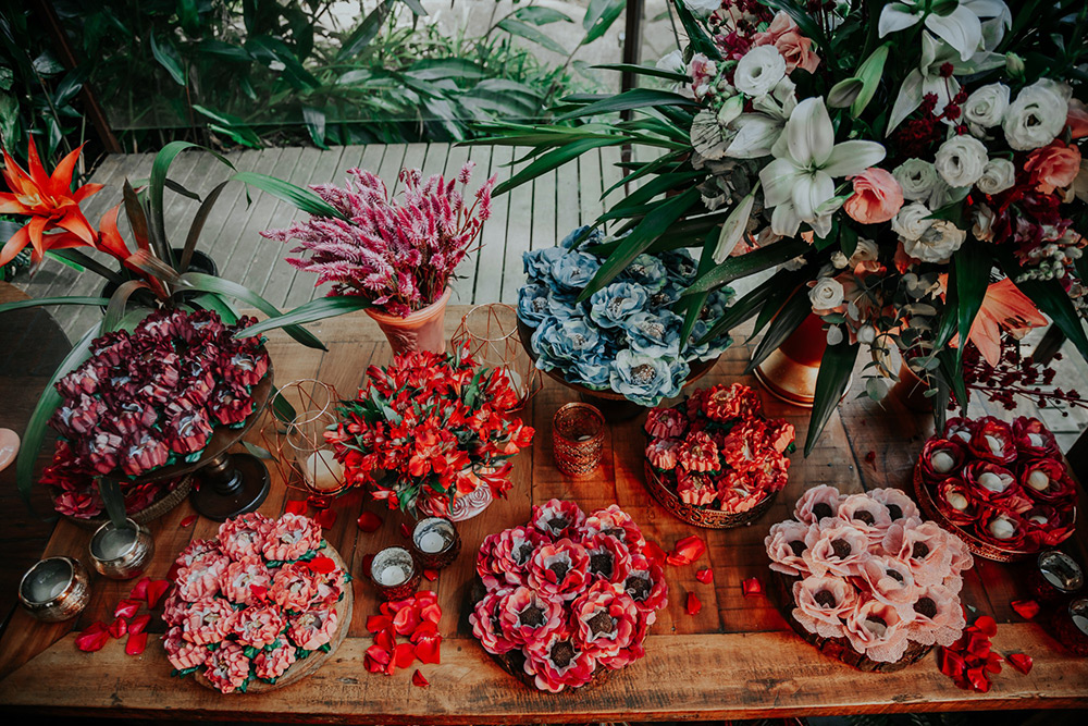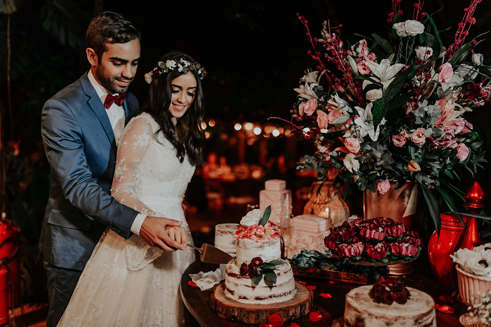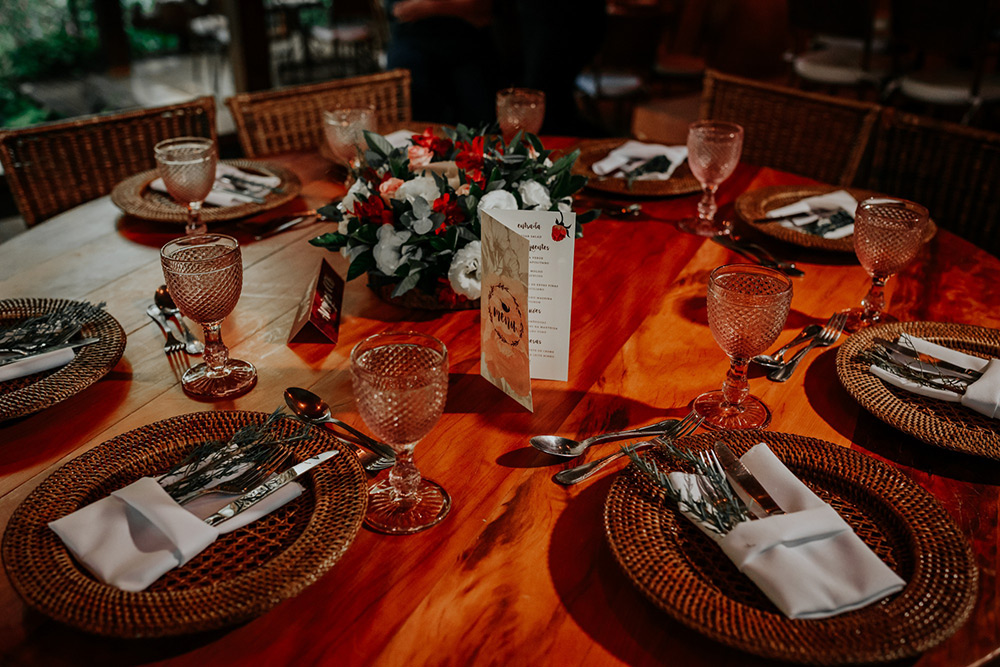 As escolhas caminharam entre o rústico e o vintage, com uma paleta de cores rica em marsala.