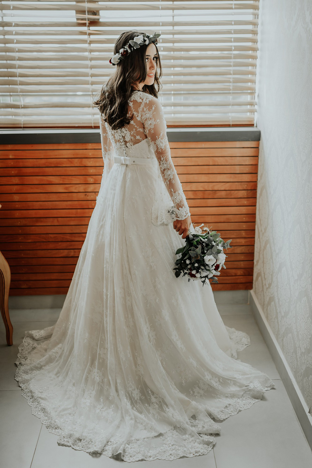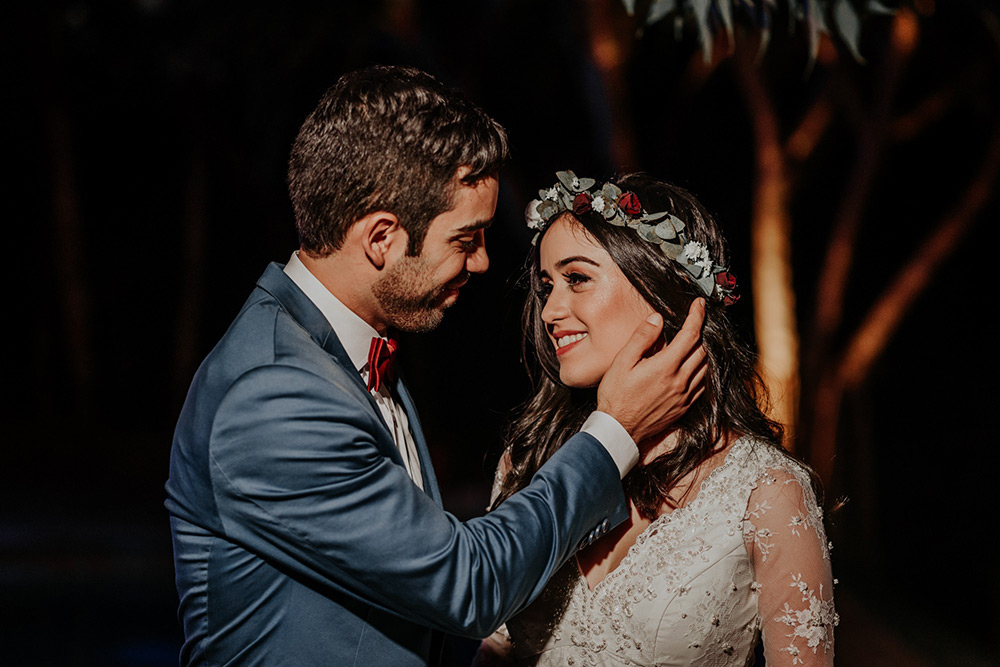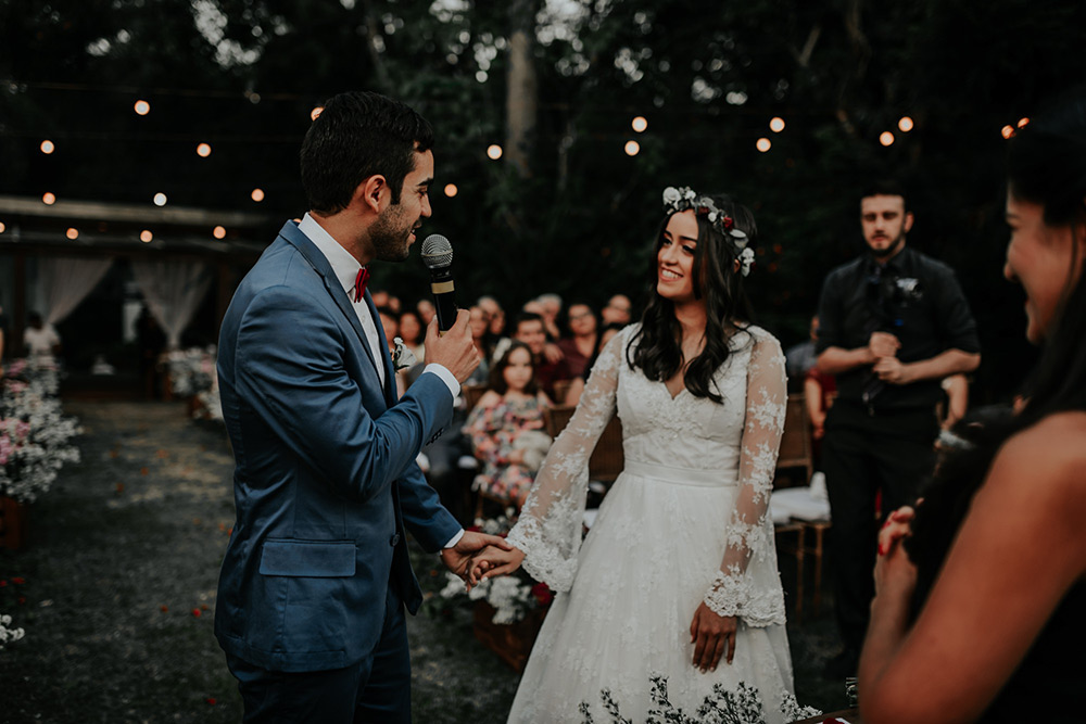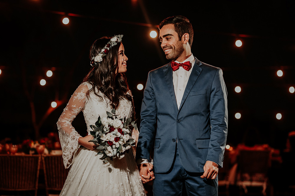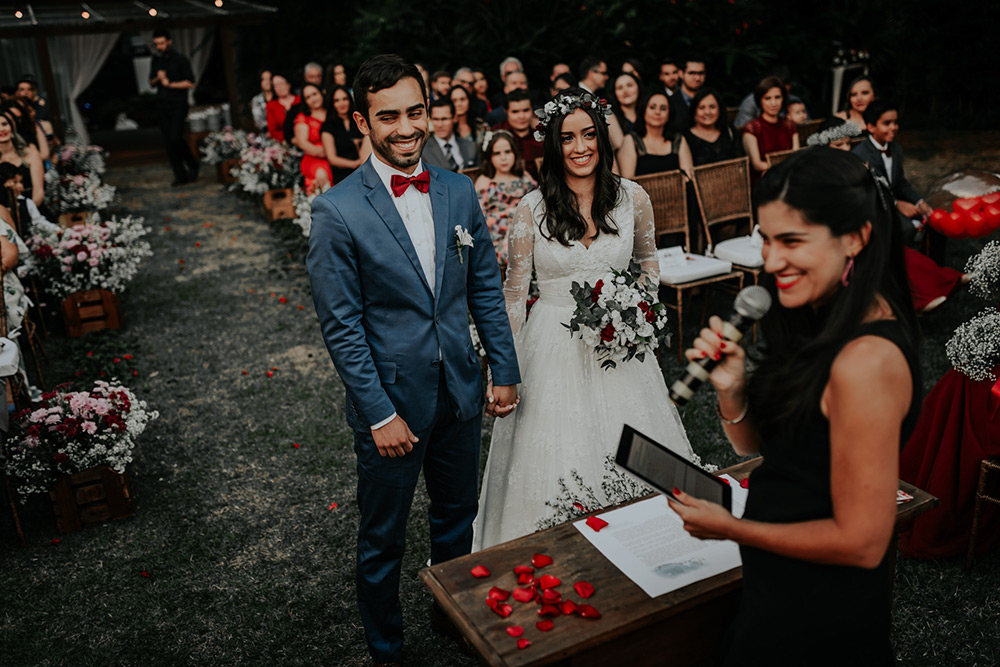 A noiva ficou linda de cabelos soltos, com vestido de mangas esvoaçantes e muita renda. Enquanto isso o noivo usou azul, garantindo perfeita harmonia com o clima leve e descontraído da cerimônia.