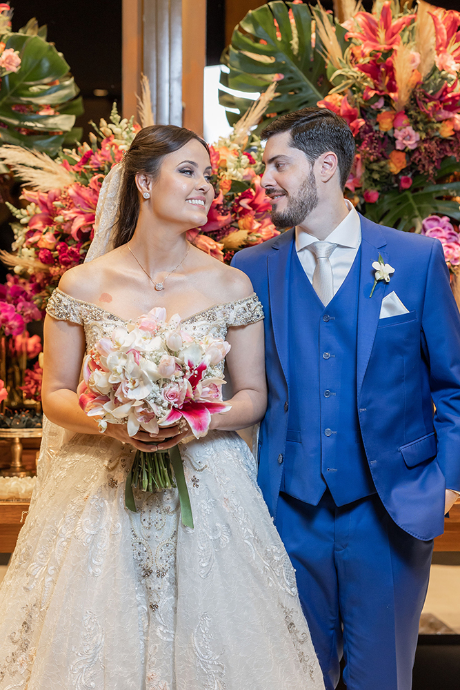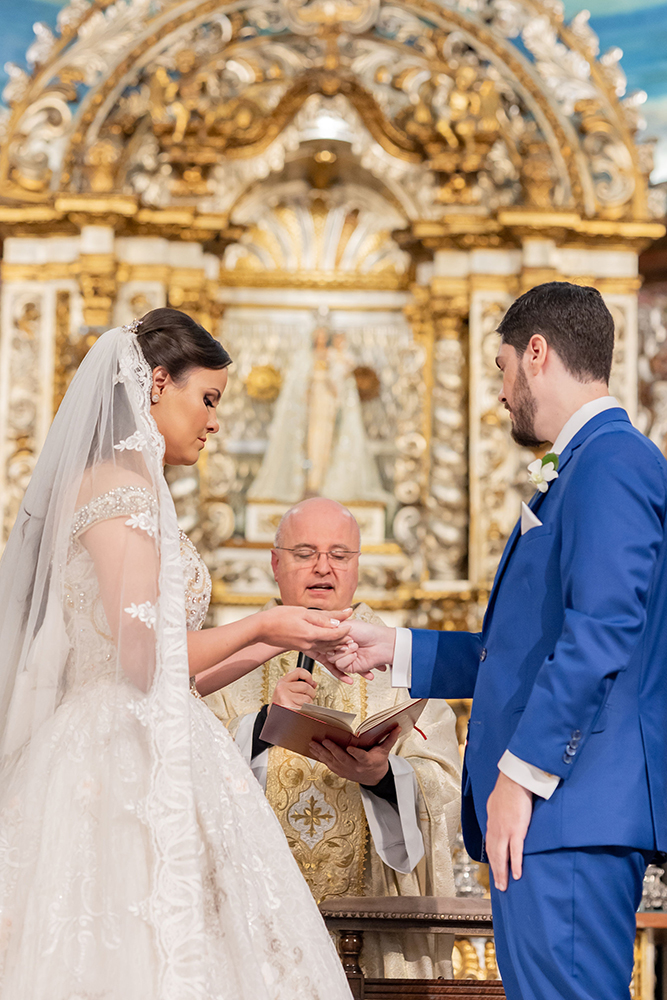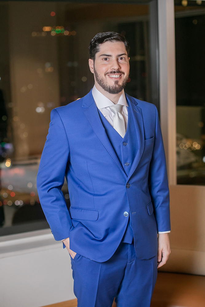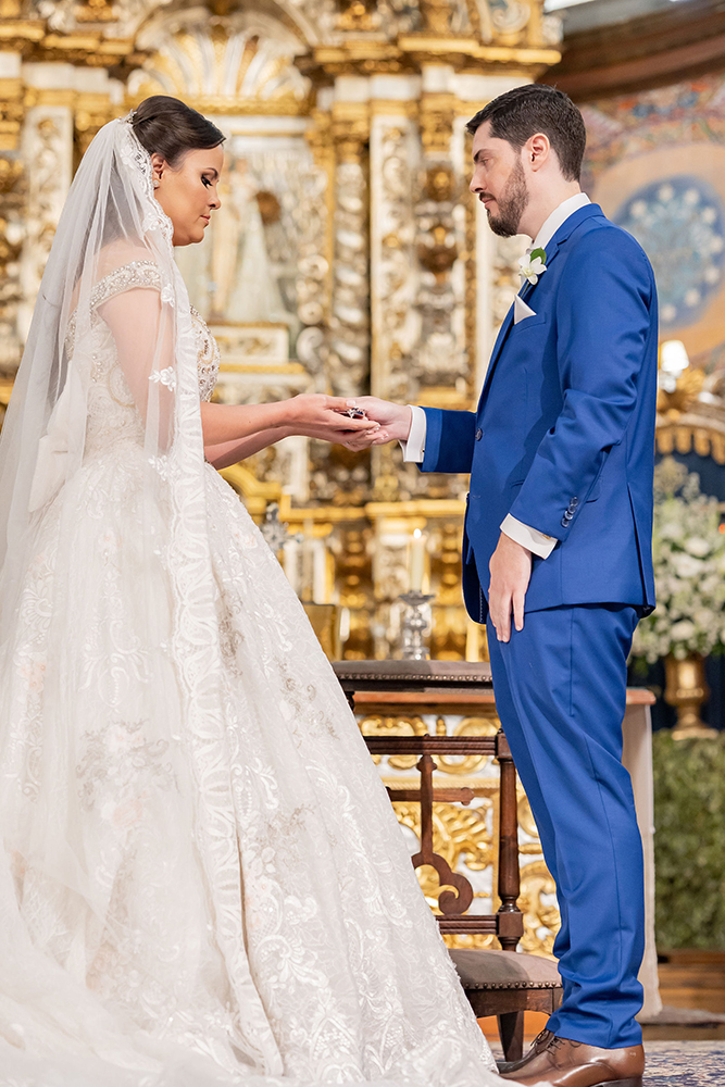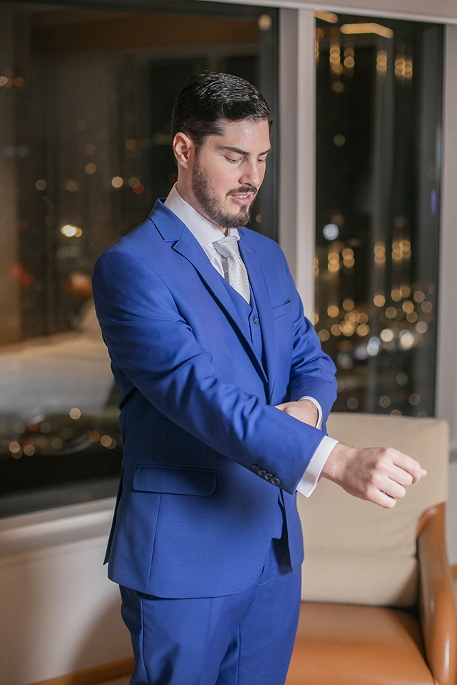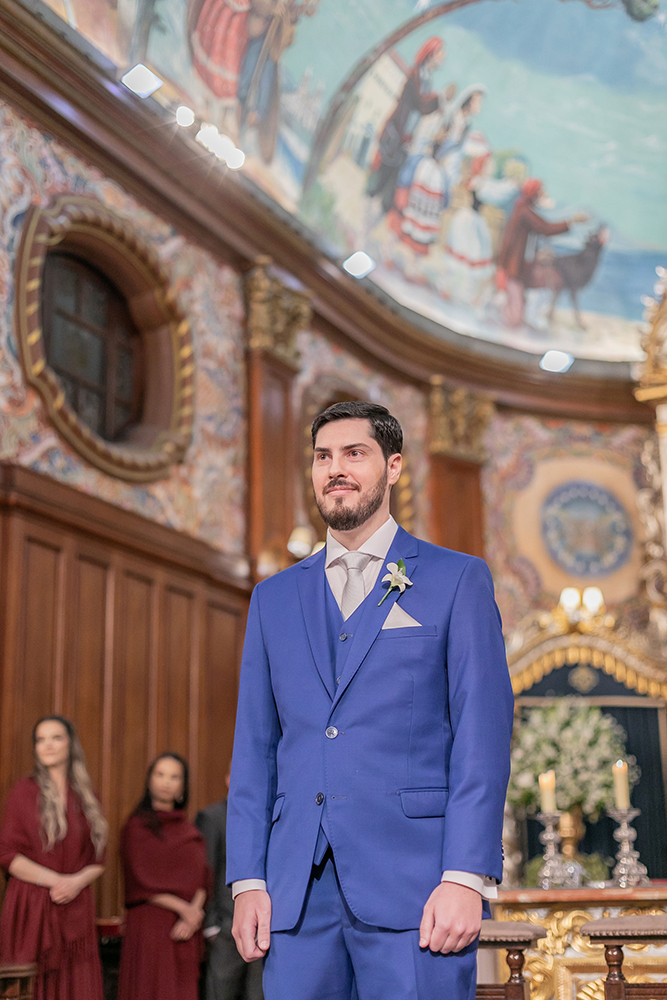 Já o noivo optou pelo traje azul com gravata branca, também muito elegante e adequado para a cerimônia na Nossa Senhora do Brasil.